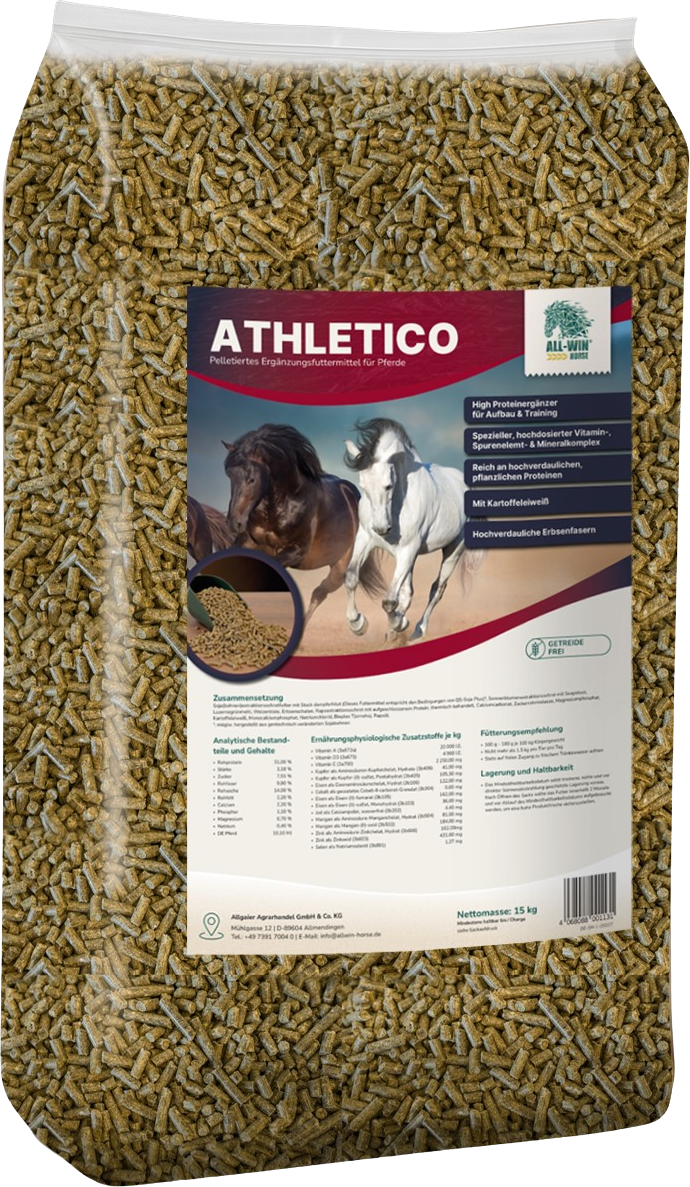 Пелетите ALL-WIN Horse Athletico са беззърнеста допълнителна храна, специално разработена за коне, нуждаещи се от целенасочена подкрепа по време на тренировки и кондициониране. Пелетите съдържат високодозов комплекс от витамини, микроелементи и минерали, както и лесно смилаеми растителни протеини от картофени протеини, грахови фибри и висококачествено екстрахирано брашно. Формулата без зърнени култури е особено подходяща за коне със специфични хранителни нужди. Благодарение на внимателно подбрания си състав, тази пелета е идеална за подпомагане на тренировъчните фази.