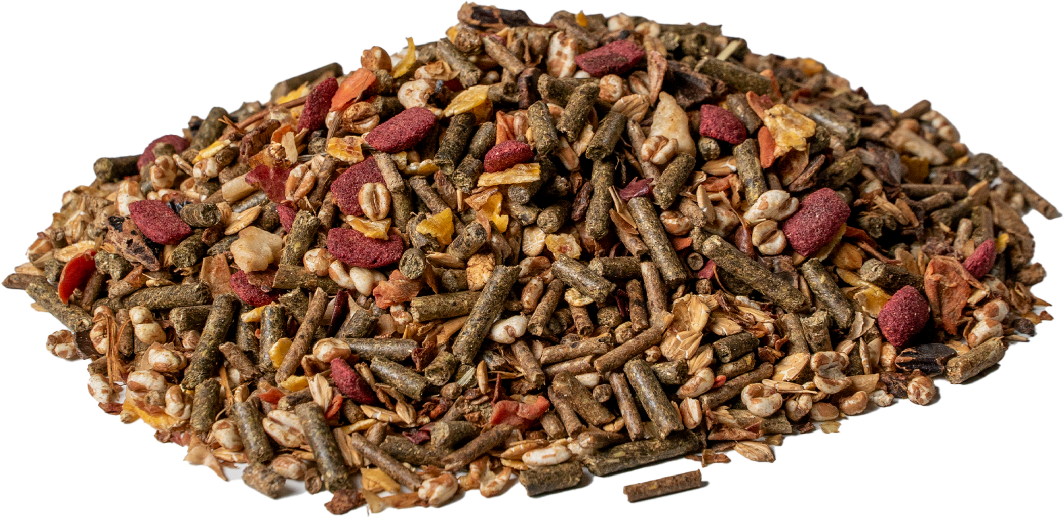 ечемичени люспи, Apfeltrester, Grünmehl, овесени трици, пшенични трици, корнфлейкс, шрот от екстракт от слънчогледи, Johannisbrotfrucht, Trockenschnitzel, Zuckerrohrmelasse, Weizen gepoppt, ечемик, Rapsöl, сушен морков, Bananenchips, ленено семе (thermisch aufgeschlossen), Rote Bete, Calciumcarbonat, Maerl