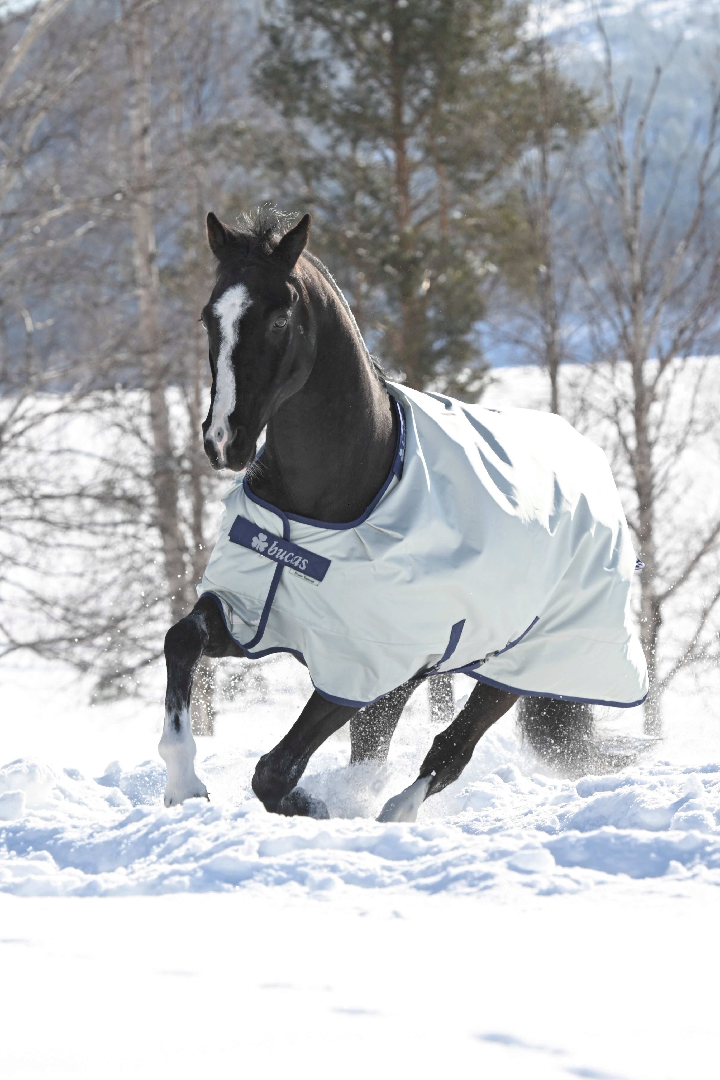 С Bucas Power Turnout можете да предложите на коня си висококачествен килим, който перфектно съчетава комфорт, функционалност и издръжливост. Здравият външен слой осигурява надеждна защита срещу вятър и атмосферни влияния, а иновативното вътрешно покритие поддържа приятен климат под килима - независимо дали е хладно или топло.