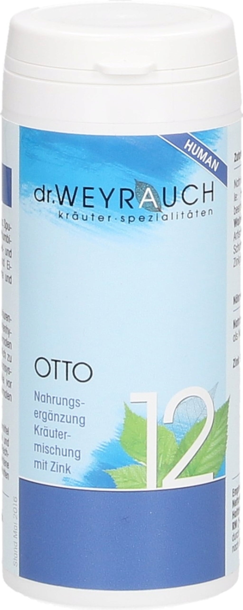 - В продукт Nr. 12 Otto:, микроелементът цинк е включен в основа от таниново сини и малинови листа, орехови черупки и дъбова кора, допълнени от артишок и бял трън. Цинкът допринася за нормалния метаболизъм на мастните киселини, нормалния метаболизъм на въглехидратите и нормалния синтез на протеини. Цинкът също така допринася за нормалното функциониране на имунната система, за защитата на клетъчните компоненти от оксидативно увреждане и за нормалния киселинно-алкален метаболизъм.