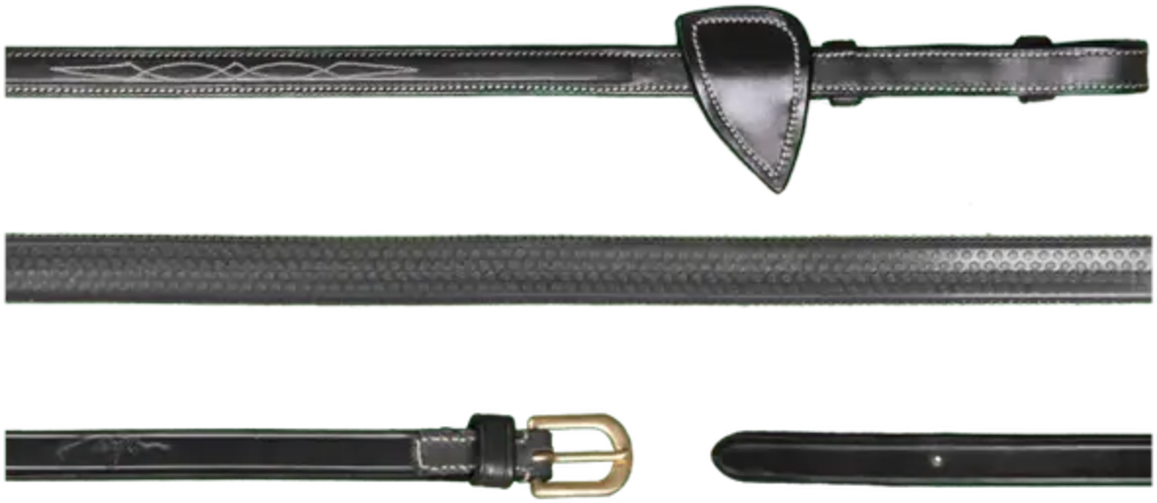 Висококачествени поводи със зона за захващане от релефна гума. Прилягат добре и осигуряват стабилен захват в дланите. Средната част и краищата, включително стоперите за мартингал, са изработени от висококачествена кожа. Светлите шевове и равномерният модел на шевовете създават красив контраст с благородната кожа.
