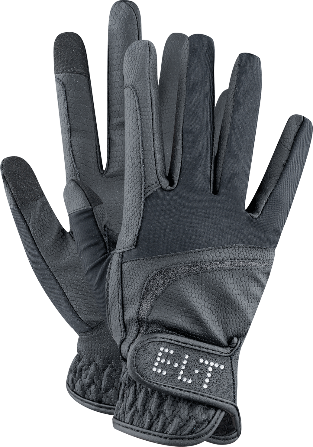 Особено впечатляващи са фините детайли, като блестящата декоративна лента и елегантният надпис E·L·T от кристалчета върху закопчаващата каишка. Освен с визията си, ръкавицата впечатлява и с техническото си изпълнение: тя е напълно съвместима със сензорни екрани, така че можете да използвате смартфона си, без да я сваляте. Вградените подсилвания за поводите гарантират дълга издръжливост и стабилен контакт с устата на коня.