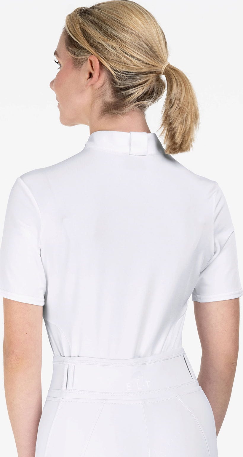 Дискретен акцент е скритият преден цип, украсен с фина блестяща лента, който придава на ризата модерна нотка. За леко усещане за блясък допринася и блестящият E·L·T лого принт върху предната част на яката. Благодарение на практичната халка на задната част на яката пластронът може да се фиксира лесно и сигурно, така че визията ви да бъде перфектна до последния детайл.