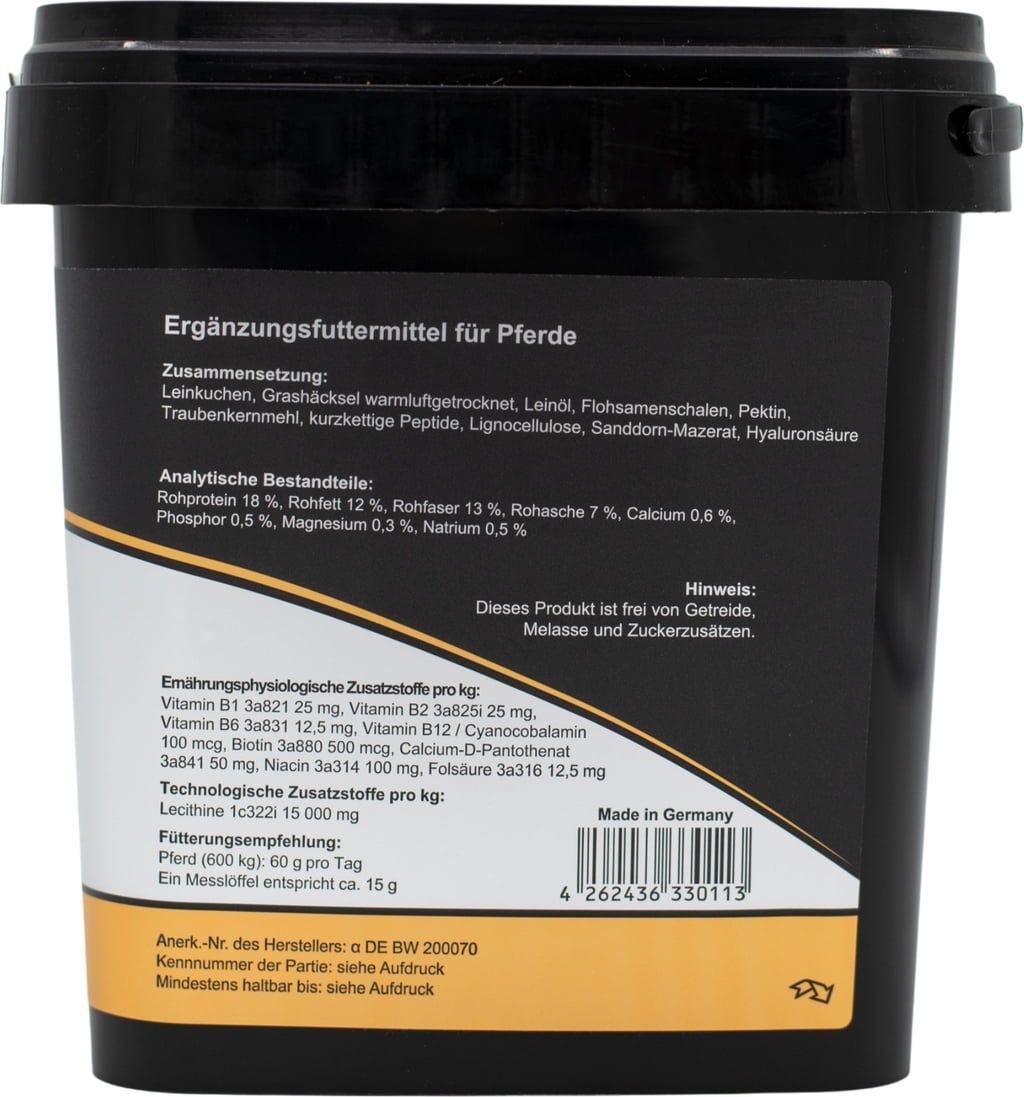 тесто от ленено семе, изсушена на топъл въздух тревна плява, Ленено масло, Люспи от псилиум, Pektin, брашно от гроздови семки, kurzkettige Peptide, лигноцелулоза, Sanddorn-Mazerat, хиалуронова киселина