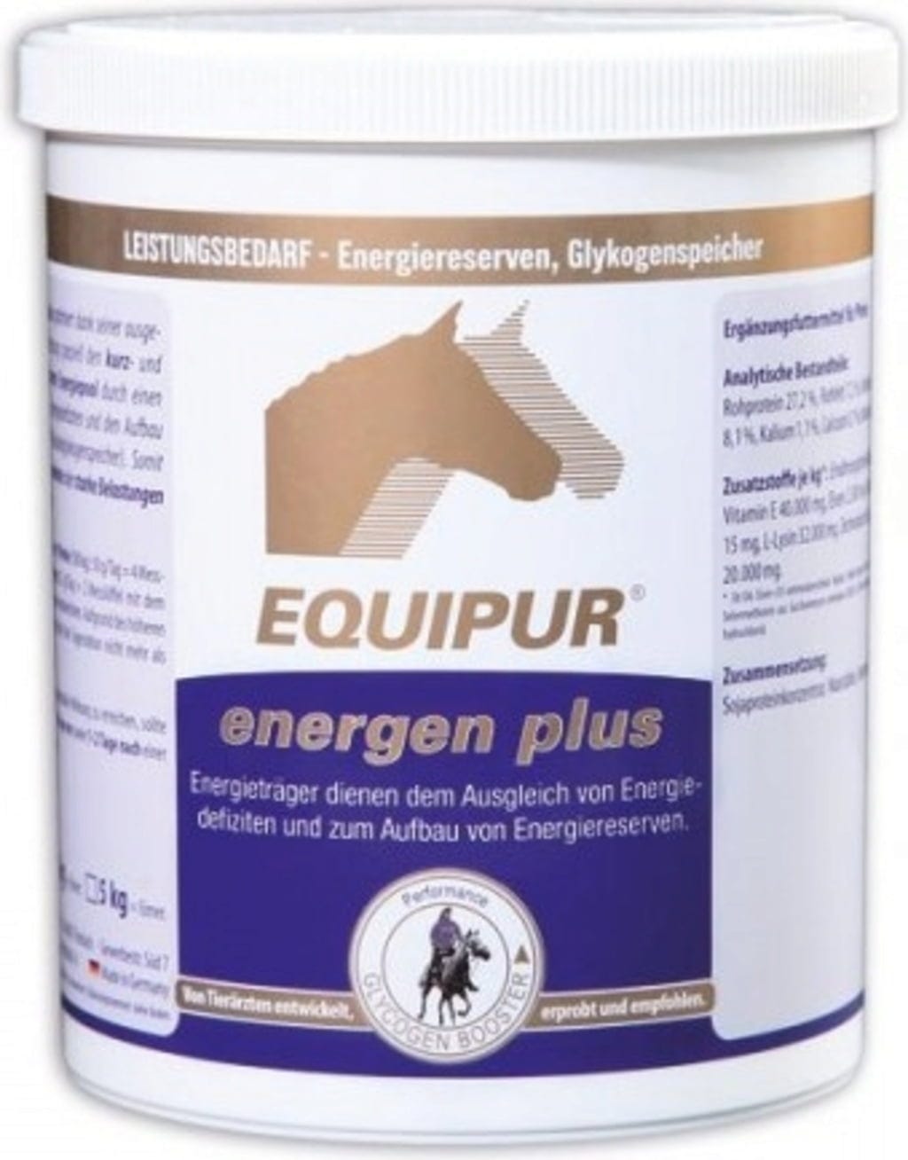 EQUIPUR - energen plus, благодарение на балансирания си състав, целенасочено оптимизира краткосрочния и средносрочния наличен енергиен запас, като бързо компенсира енергийните дефицити и изгражда нови енергийни резерви (мускулен гликоген). Това позволява на конете да се справят по-добре с необичайни или натоварващи натоварвания.
