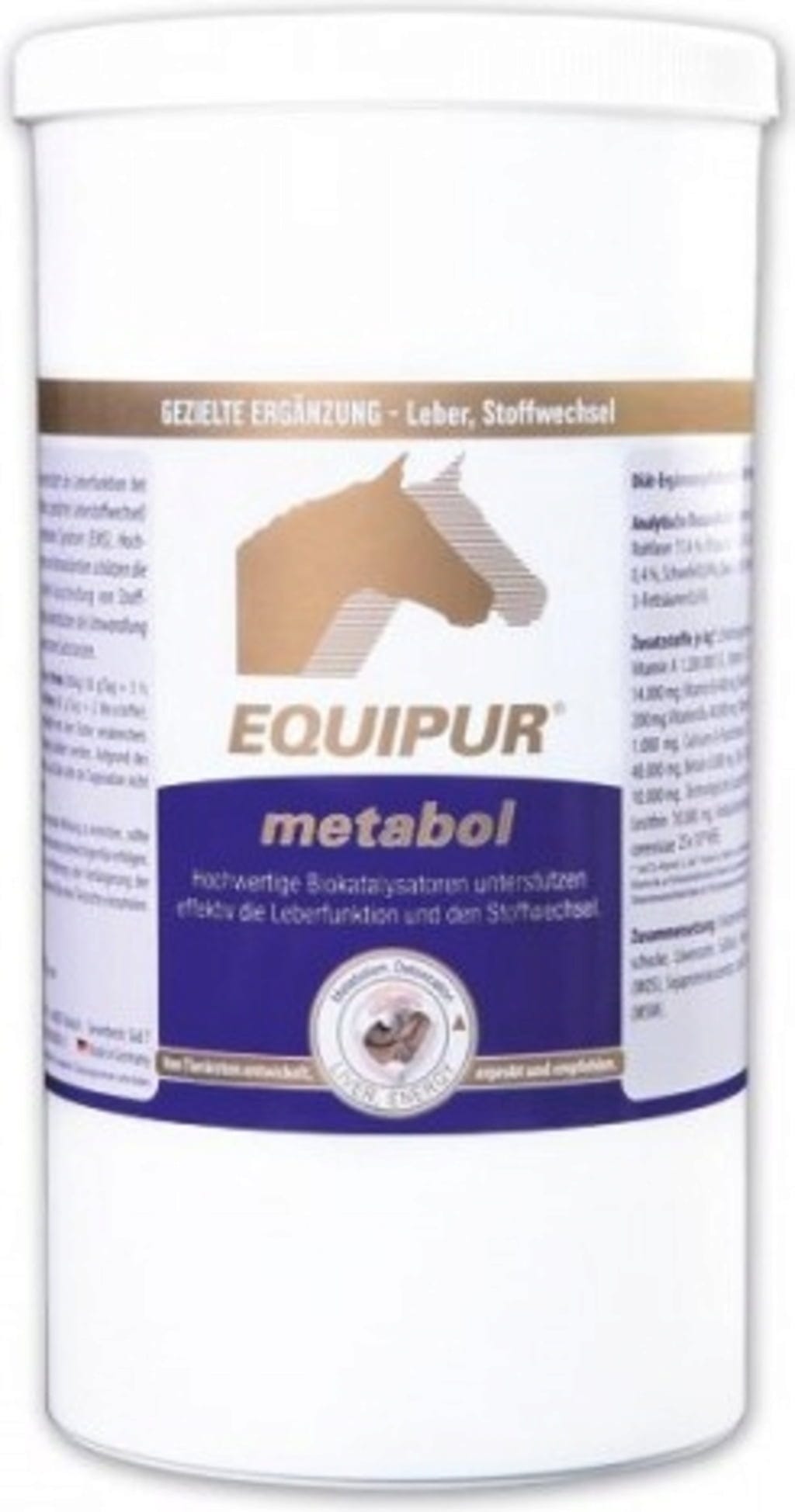 EQUIPUR-metabol е допълнителна храна за поддържане на нормалната функция на черния дроб при конете. Съставът му от подбрани билки като бял трън, артишок, глухарче и корен от женско биле може да допринесе за производството на жлъчка от коня. Метаболитният комплекс съдържа също холин и лецитин, цинк и бетаин, аргинин от соев протеинов концентрат и важни ненаситени есенциални мастни киселини. Формулата е допълнена с метионин, MSM, витамини A, C и E, както и пробиотици и пребиотици. Формулата може да се дава и на коне с EMS и ламинит.