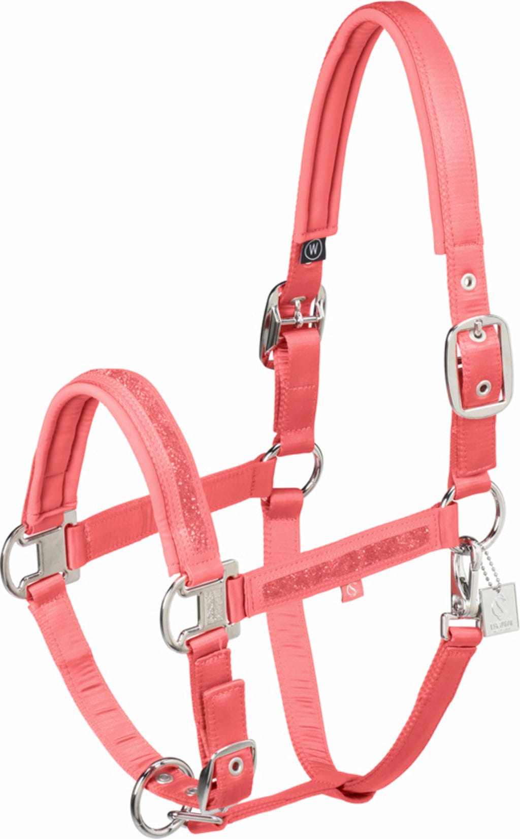 Елегантен халтер с бляскави детайли. Матово-гланцовото покритие е комбинирано с висококачествени, сребристи метални елементи и шикозни скъпоценни камъни на носника и скулите. Меката софтшел подплата на главата и носника осигурява комфорт и може да се центрира перфектно с помощта на две катарами. Устойчивата на разкъсване лента, използвана като основен материал, гарантира здравина и издръжливост. Разполага с допълнителен етикет ESKADRON от лявата страна.