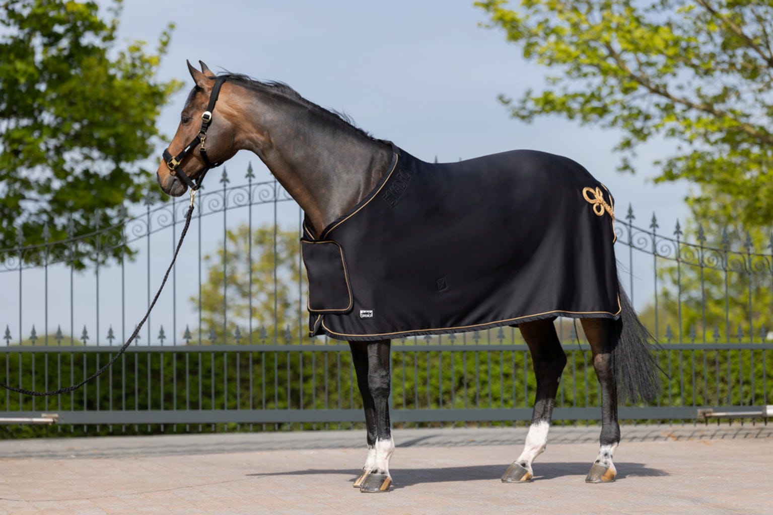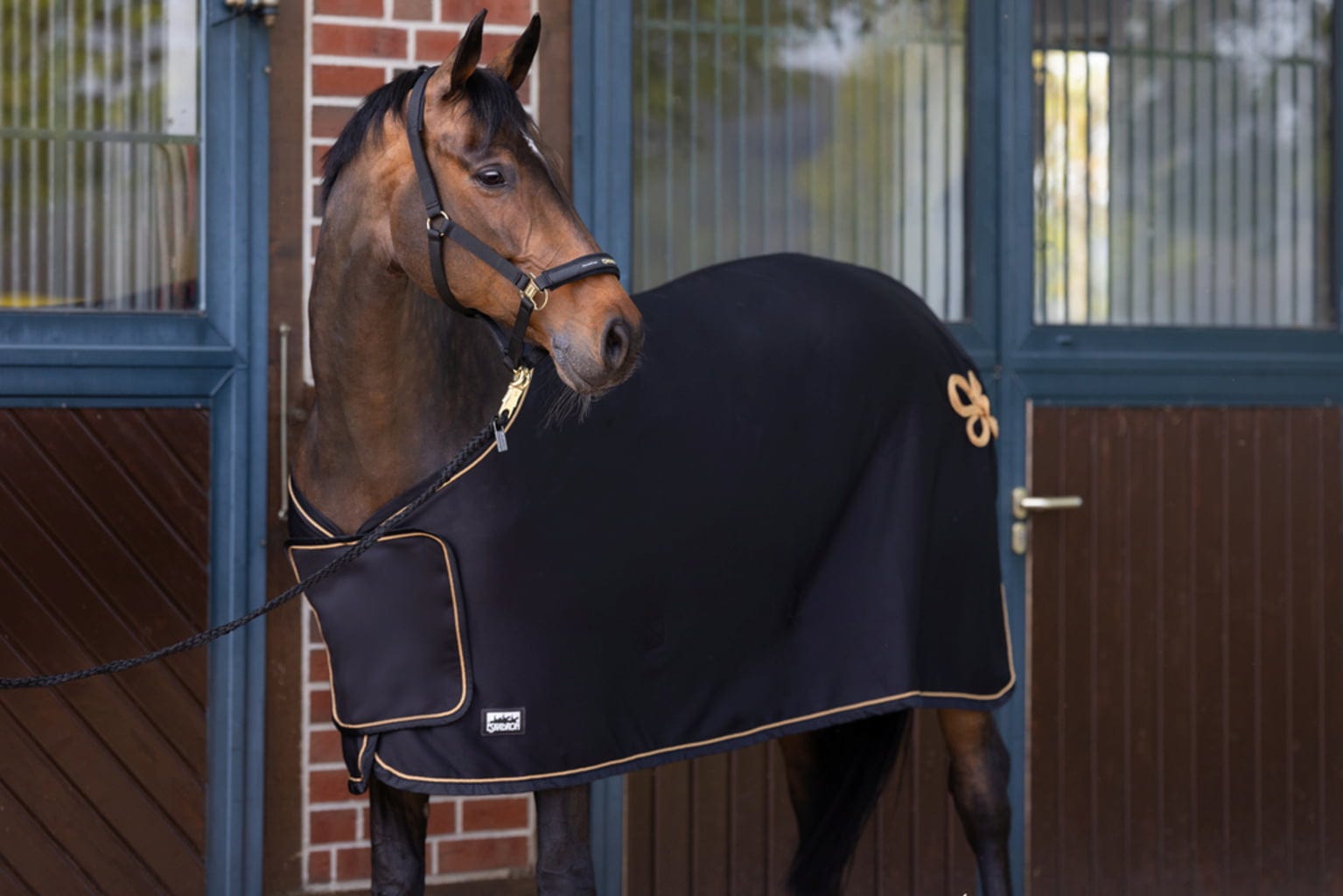 С хладилното одеяло Eskadron, изработено от висококачествен полар, вие сте перфектно екипирани – независимо дали сте в конюшнята, на състезание или по време на транспорт. Дишащият материал осигурява комфортен климат и спомага за оптимално отвеждане на влагата. Благодарение на елегантната кройка на одеялото за изложби с капак на гърдите и изискани детайли като лъскавата тапицерия и декоративния шнур на опашката, вашият кон ще бъде не само функционално, но и изключително стилно екипиран.