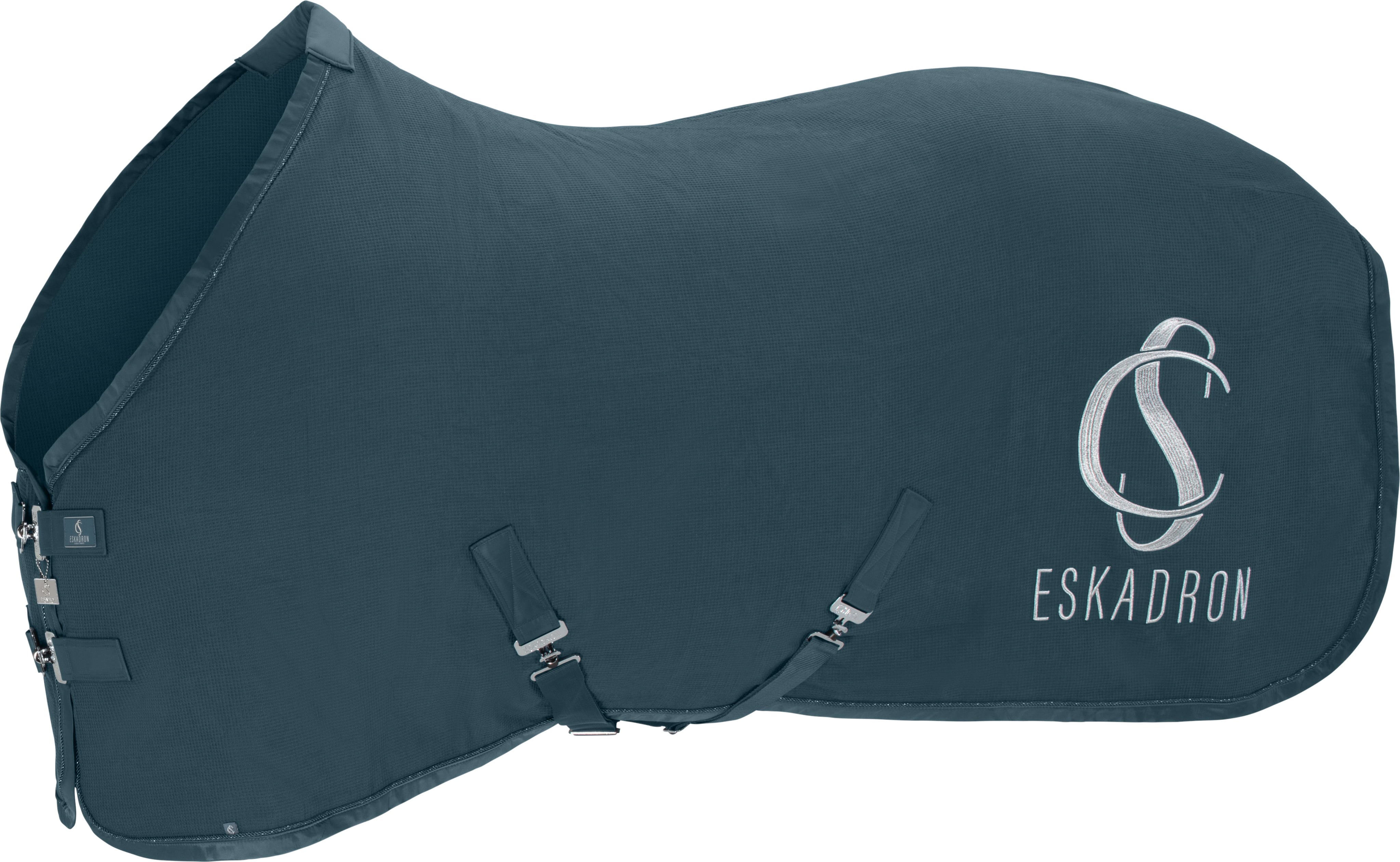 Охладителното килимче Waffle Cotton, с триизмерната си структура тип „пчелна пита“, е истинско чудо на функционалността за топлите дни или преходните сезони. Чистата памучна вафлена пике материя позволява отлична циркулация на въздуха, гарантирайки, че конят ви ще изсъхне ефективно след работа, без да прегрява. Елегантната бродирана емблема и лурексов шнур върху лъскавата тапицерия придават на килимчето висококачествен вид, а подвижните кръстосани ленти осигуряват пълна гъвкавост.