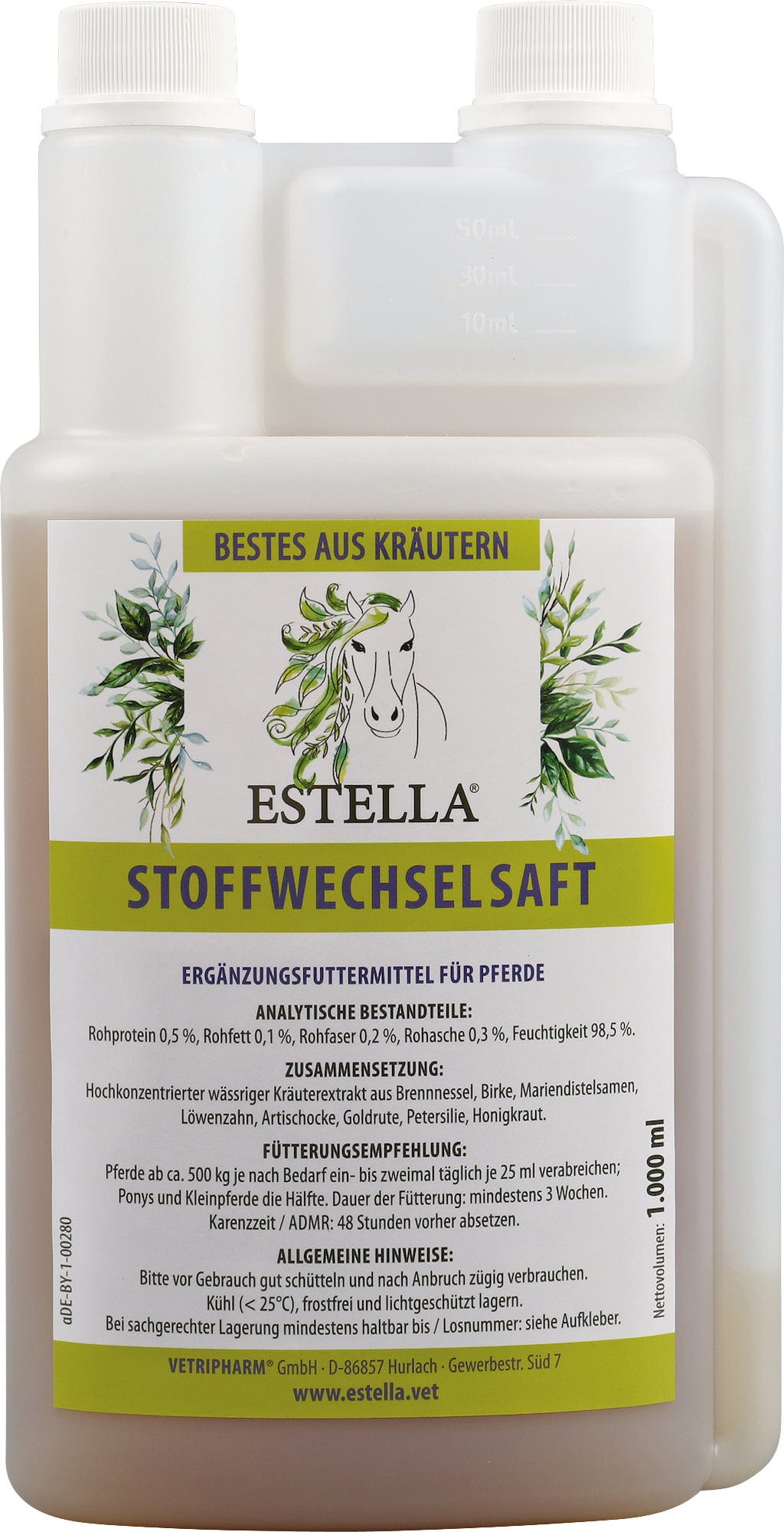 Сокът за обмяна на веществата ESTELLA е оптимална подкрепа за вашия кон. Освен коприва, глухарче и артишок, той съдържа и други естествени съставки. Може да се използва за хранене на възрастни коне, понита и млади коне.