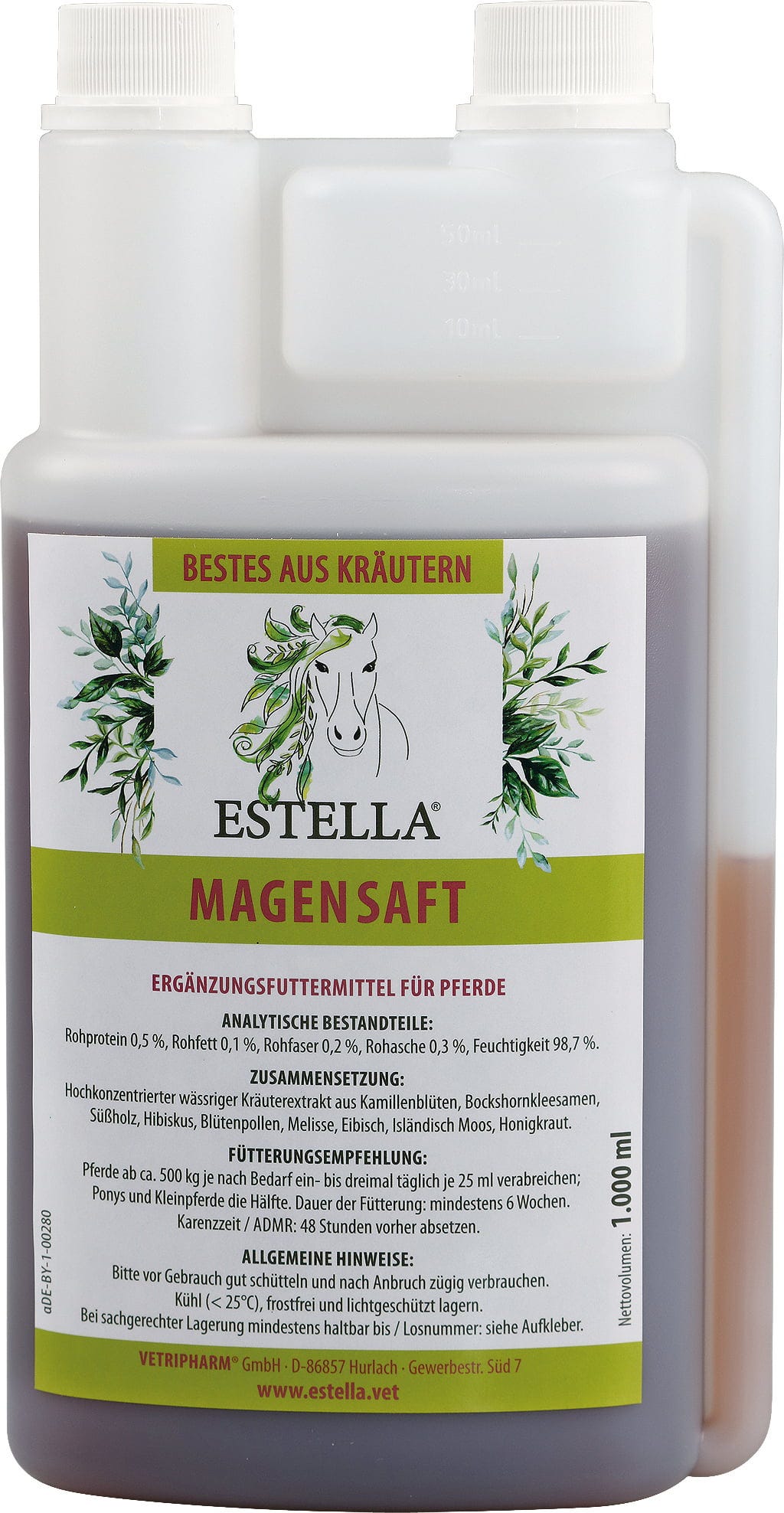 Стомашният сок на ESTELLA е обогатен с различни билки и осигурява оптимална подкрепа за конете. Съставът на сока съдържа цветове от лайка, семена от сминдух, маточина и блатен аир, наред с други неща.