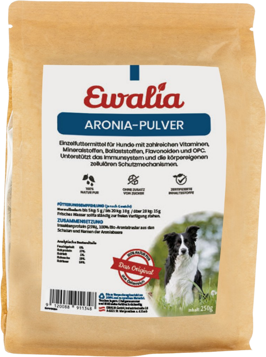 Аронията е истинска суперхрана, пълна с хранителни вещества. Освен всичко друго, тя съдържа фибри, флавоноиди, минерали и витамини. Твърди се, че нейните биоактивни компоненти имат антиоксидантни свойства, което ѝ позволява да действа като уловител на свободните радикали. Наистина ценно допълнение към диетата на всеки домашен любимец. Прахът от арония на Ewalia се произвежда без изкуствени оцветители, консерванти или добавена захар.