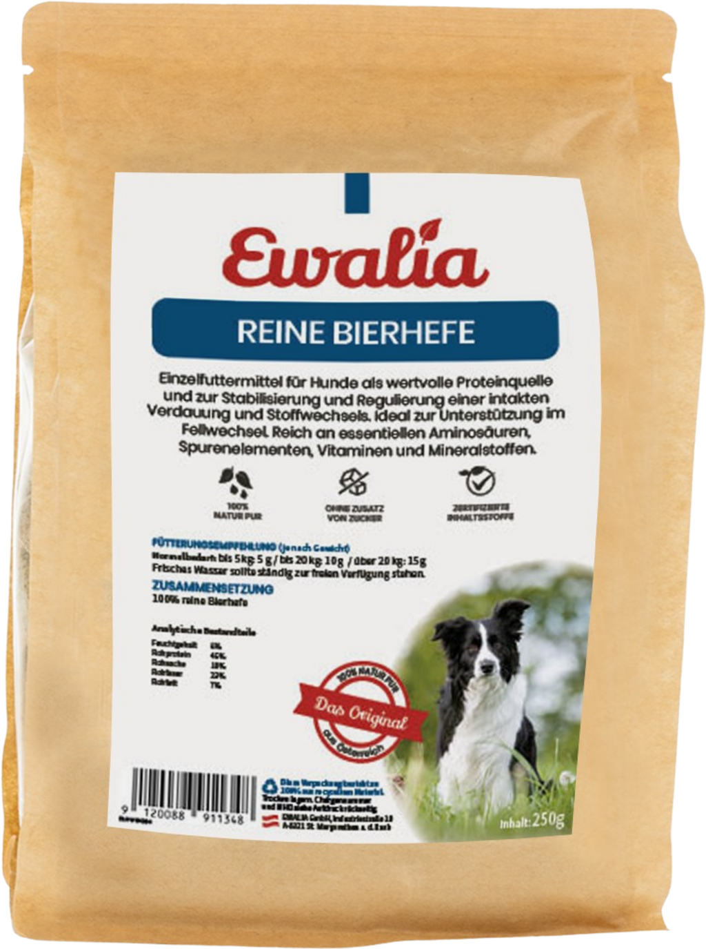 Бирената мая, известна със своите ценни протеини, се използва за обогатяване на дневната фуражна дажба. Чистата бирена мая от Ewalia, разбира се, се произвежда без тестове върху животни, консерванти, оцветители или добавена захар. Този натурален продукт може да подпомогне естествената функция на храносмилателната система и да допринесе за нормална кожа и лъскава козина.