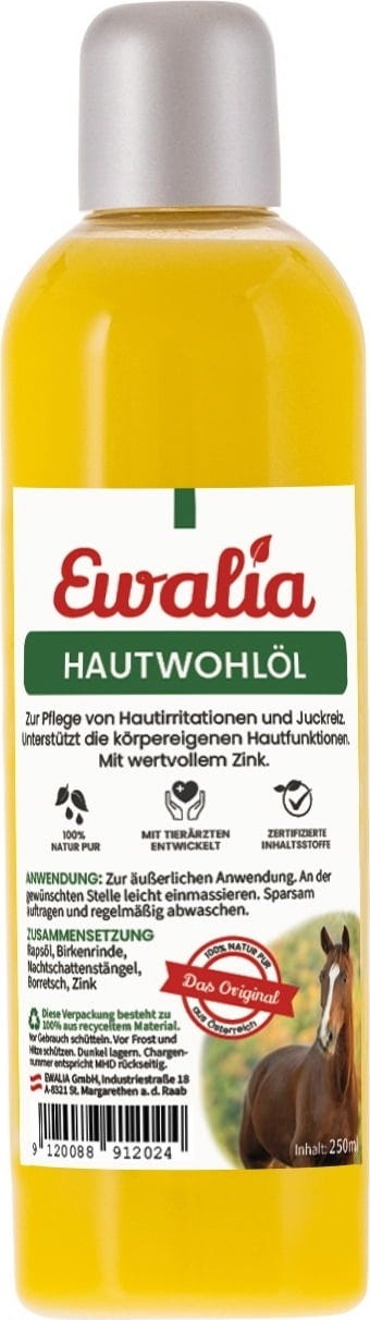 Маслото от екзема на EWALIA е подходящо за облекчаване на кожно дразнене и сърбеж. То успокоява и регенерира кожата на вашия кон след протриване и дразнене, причинено от сладък сърбеж. С ценен цинк.