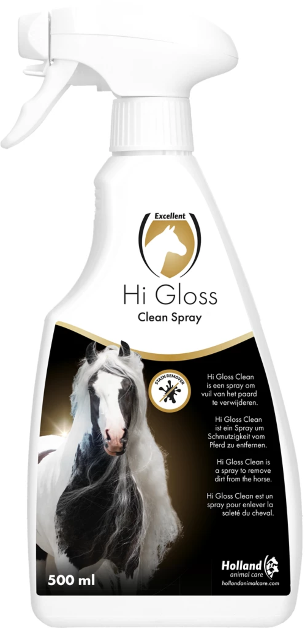Hi Gloss Clean е висококачествен, мощен почистващ спрей за козина, гриви и опашки на коне. Особено през есента и зимата, когато миенето на конете става трудно, този спрей осигурява ефективно и лесно почистване без необходимост от къпане. Той надеждно премахва петна като тор, урина и петна от трева.