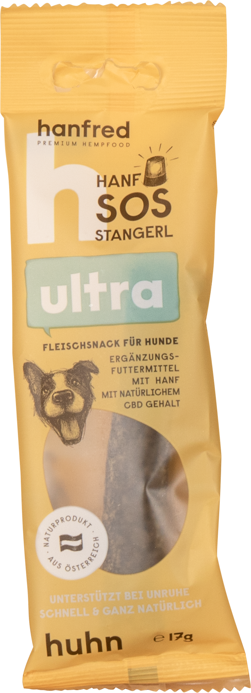 SOS Ultra Sticks съдържат 25% коноп и са допълваща храна за вашето куче – особено полезни при пътуване или в непознати ситуации. Направени от сочно месо и конопен прах, без излишни добавки.