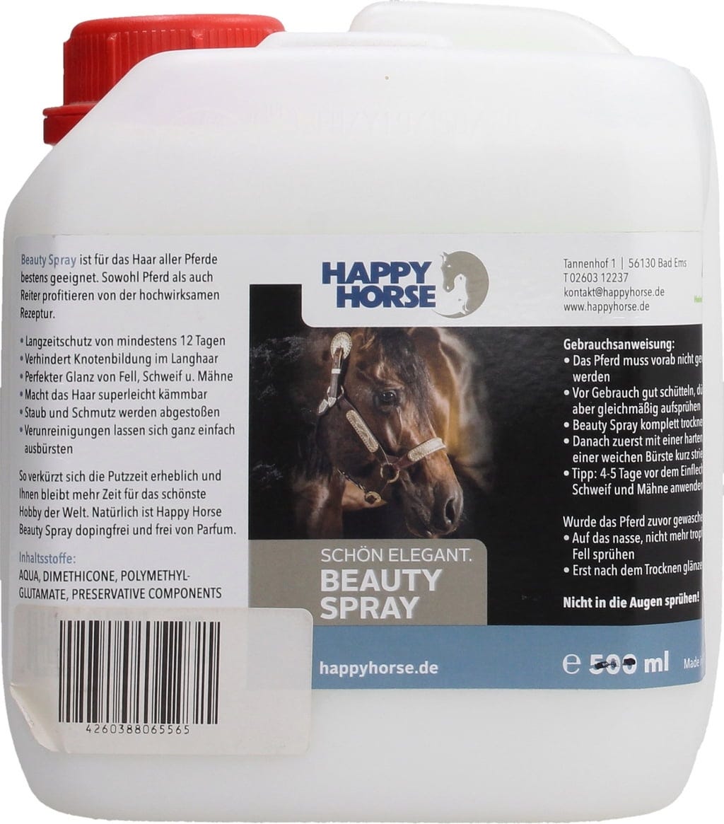 Beauty Spray придава блясък на гривата, опашката и козината. Внимателно разработената формула за грижа обгръща козината и косъма до 12 дни и предотвратява образуването на възли в дългите косми. За лесно разресване и по-малко усилия при грижата за коня. Подходящ за всички видове козина.