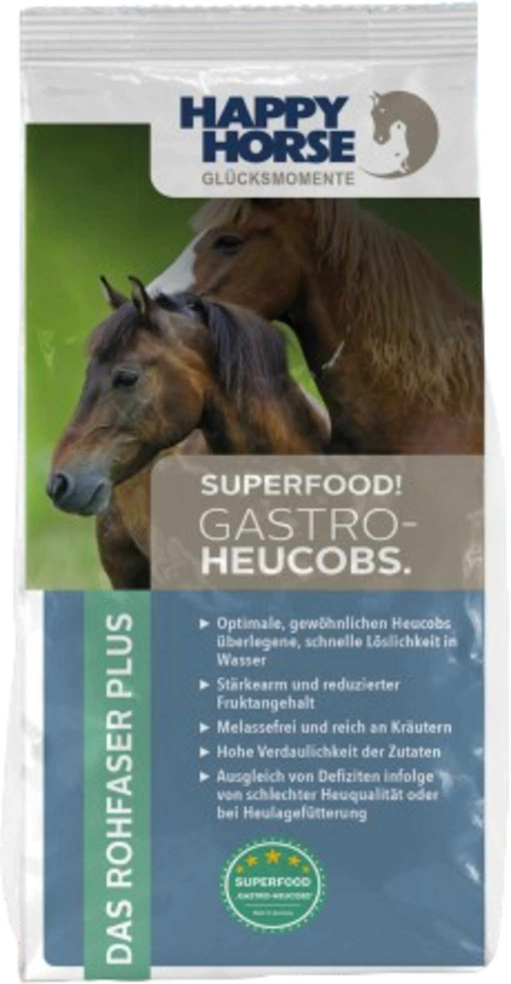 Gastro Hay Cobs от Happy Horse съдържа подбрани треви и ценни ливадни билки. Тревите и билките са внимателно изсушени при ниски температури, за да се запазят напълно важните хранителни вещества. Освен това кочаните се нуждаят само от кратко време за накисване и са лесни за приготвяне.