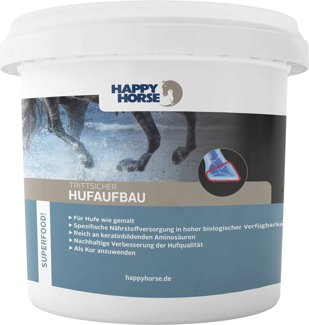 Проектирани и произведени според най-новите научни открития, пелетите Hufaufbau от Happy Horse впечатляват със своята висока бионаличност. Специалната смес от хранителни вещества за подпомагане на растежа на копитата и качеството на роговото вещество е произведена с високо съдържание на креатин-образуващи аминокиселини, с биотин, естествени билки и минерали, както и високо бионалични микроелементи. Съставки като бирена мая, ленено семе и водорасли хлорела служат като важни източници на протеини.