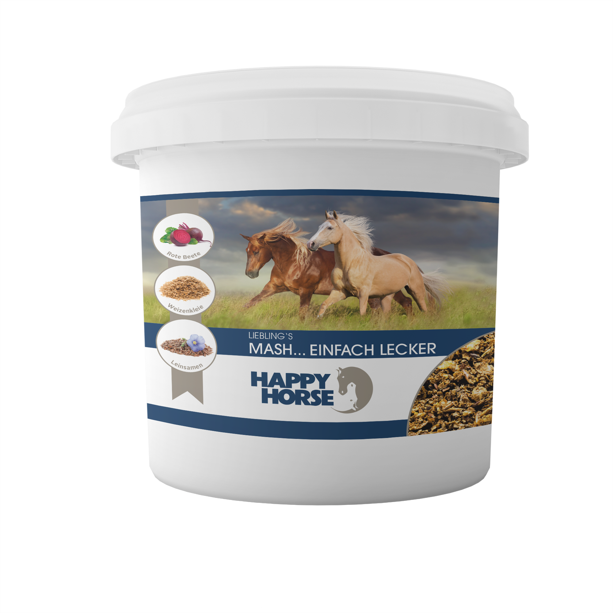 Търсите ли особено вкусно допълнение към ежедневната дажба на вашия кон? Happy Horse Lieblings Mash съчетава висококачествени фибри, студено пресовани масла и естествени съставки в лесно смилаема маш-храна - идеална като награда или като редовна добавка към фуража.