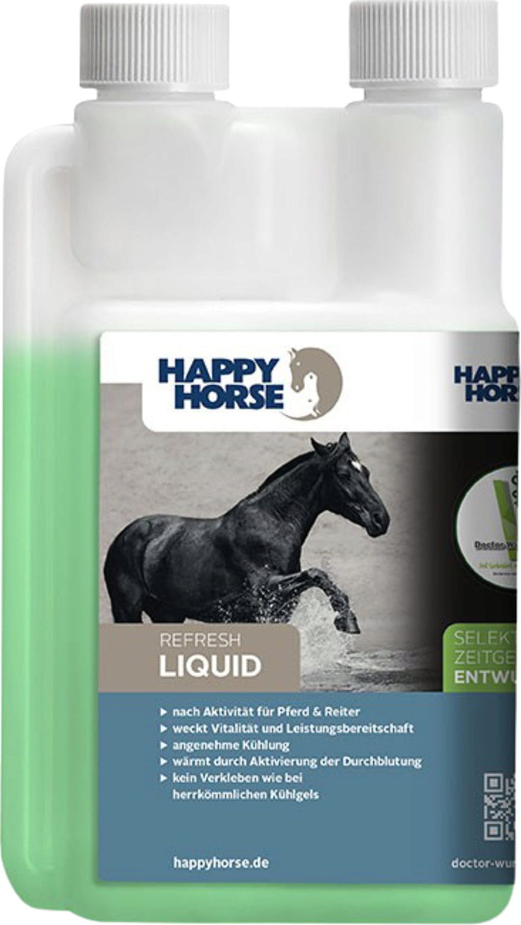 Refresh-Liquid за кон и ездач от Happy Horse съчетава свеж ментол със син евкалипт и хидратиращо алое вера. Формулата се отличава със своя охлаждащ ефект и е оптимално подходяща за регенеративно приложение след спортно натоварване.