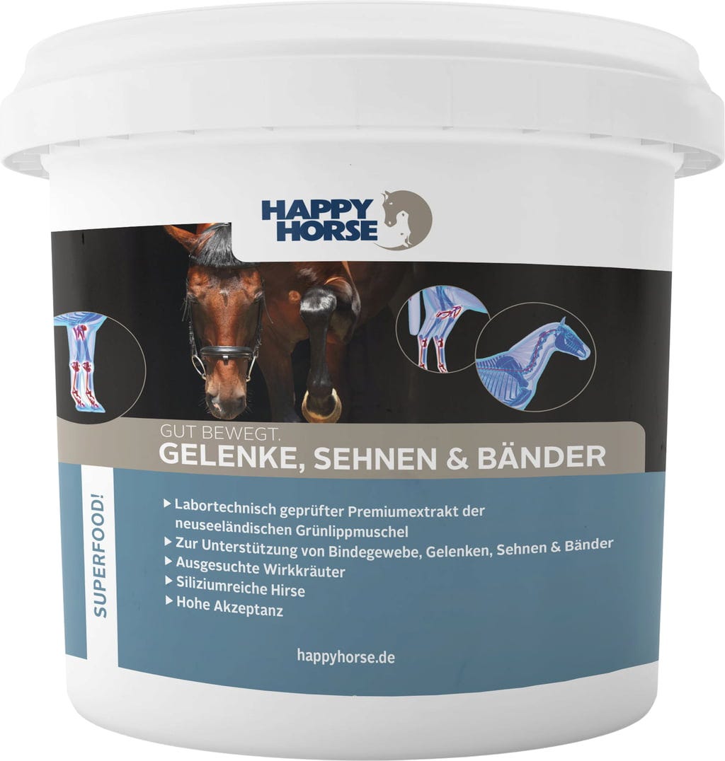 Разработени в дългогодишно сътрудничество с експерти, пелетите Gelenke, Sehnen & Bänder от Happy Horse съдържат оптимизиран хранителен комплекс, който може да допринесе за целенасочената подкрепа на целия опорно-двигателен апарат. Екстракти от лиофилизирани, вулканично минерализирани морски дарове и от оригинална новозеландска зеленоуста мида намират своето място в тази рецепта. Внимателен подбор от витамини и микроелементи, както и омега-3 мастни киселини, богато на силиций просо, бирена мая, пшенични кълнове и микроводорасли допълват оптимално специфичната формула. Подходящи за коне от всяка порода и възраст.