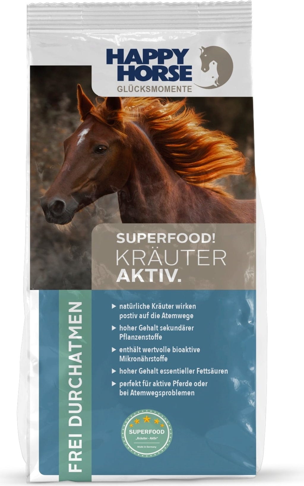Рецептата на Superfood Herbs Active от Happy Horse е адаптирана към нуждите на активни и здрави коне. Тази специално адаптирана храна има по-високо енергийно съдържание от висококачествени маслени компоненти, заедно с микроелементи и билки, което я прави идеалният избор за допълване на ежедневната овесена храна.