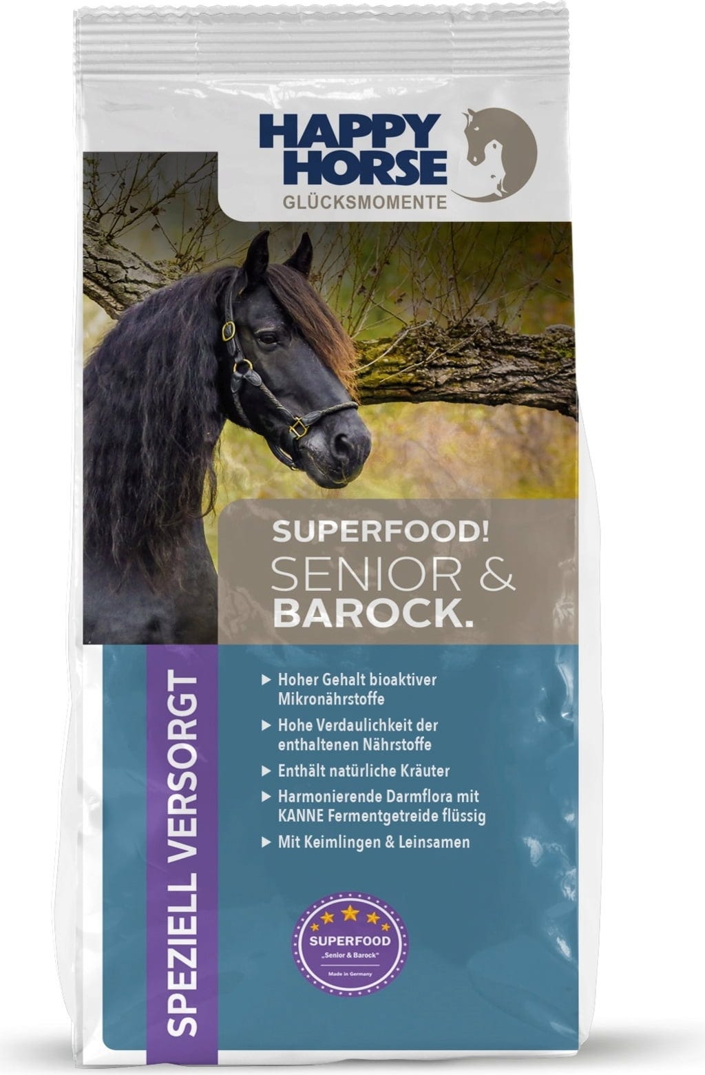 С висока плътност на хранителните вещества и биоактивни микроелементи, Happy Horse адаптира формулата на своя Superfood Senior & Barock специално към нуждите на възрастните коне и бароковите породи коне. Освен всичко друго, микроелементите цинк, мед, селен, манган и кобалт могат да подпомогнат метаболитната активност на коня, което от своя страна може да допринесе за подпомагане на храносмилането и по-добро усвояване на хранителните вещества. Освен това Happy Horse използва и в този състав оригиналния Kanne Fermentgetreide®, който осигурява повече вкус и със своята висока ензимна активност може да допринесе за нормална чревна флора.