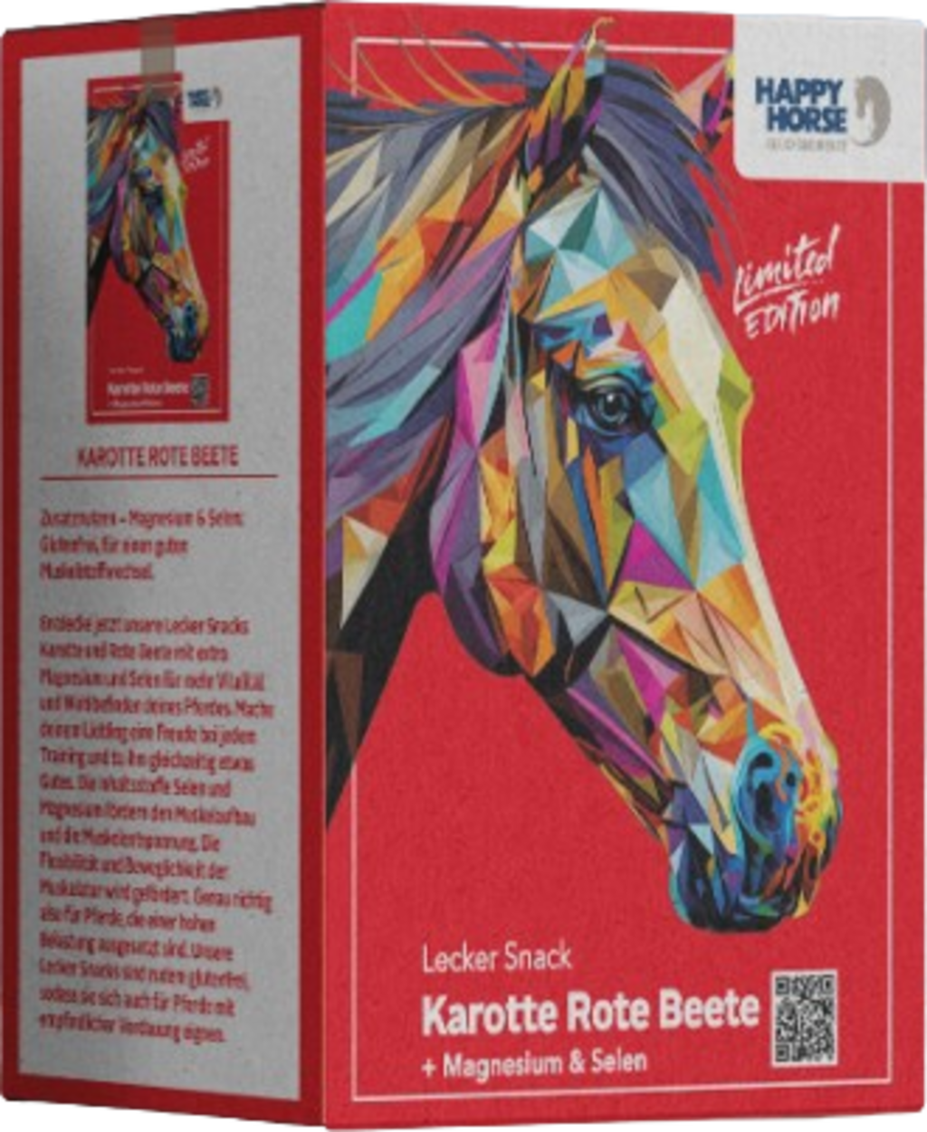 Вариантът Tasty Snack морков и червено цвекло + магнезий и селен прави любителите на зеленчуци сред конете щастливи. Сочно червено цвекло и вкусни моркови допълват безглутеновата рецепта. Оптимизирани с магнезий и селен, те са първият избор за спортни коне и всички, които са изложени на голямо натоварване.