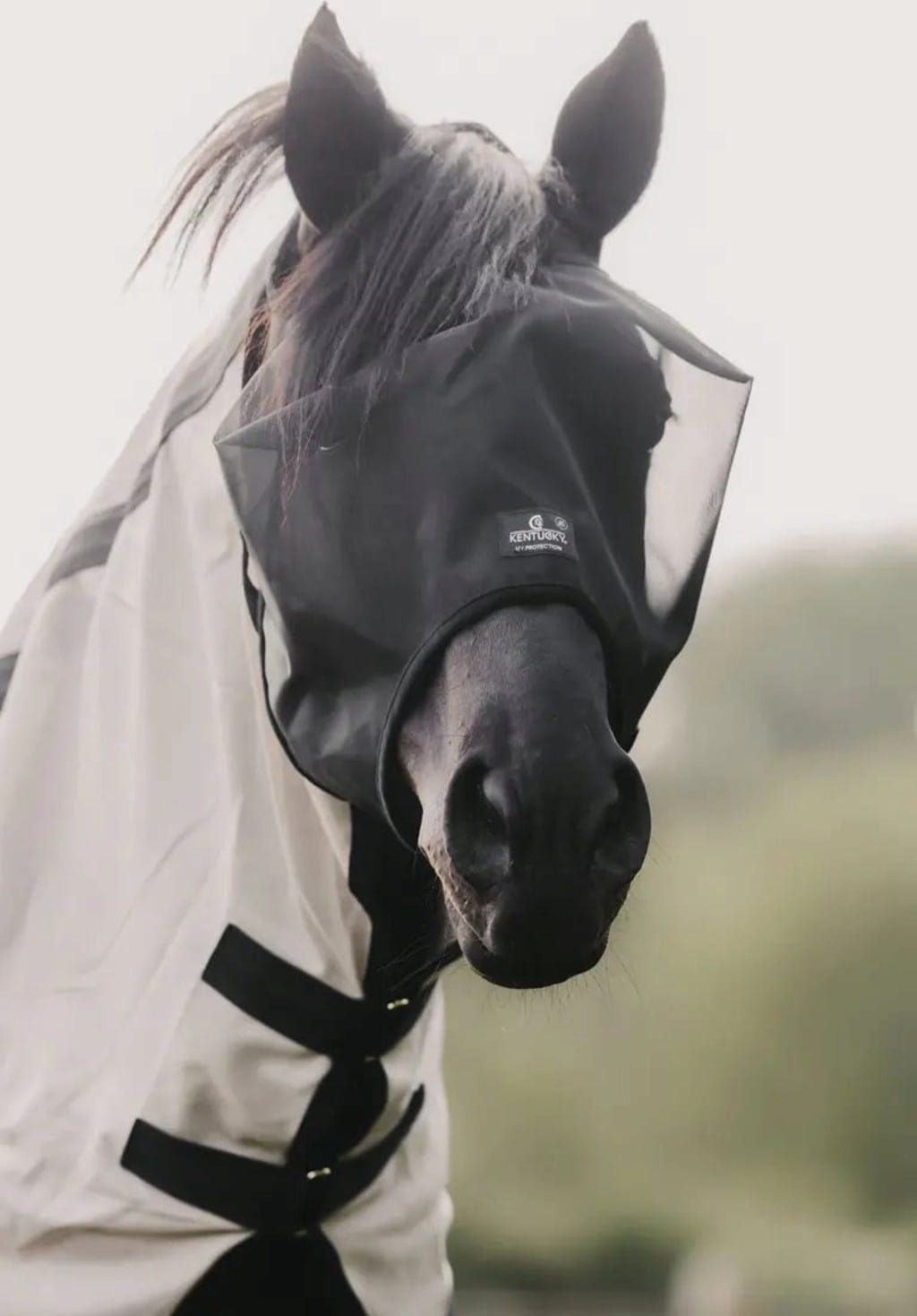 Това ефективно отблъсква мухи и други вредители, а маската предпазва коня ви и от UV лъчение.