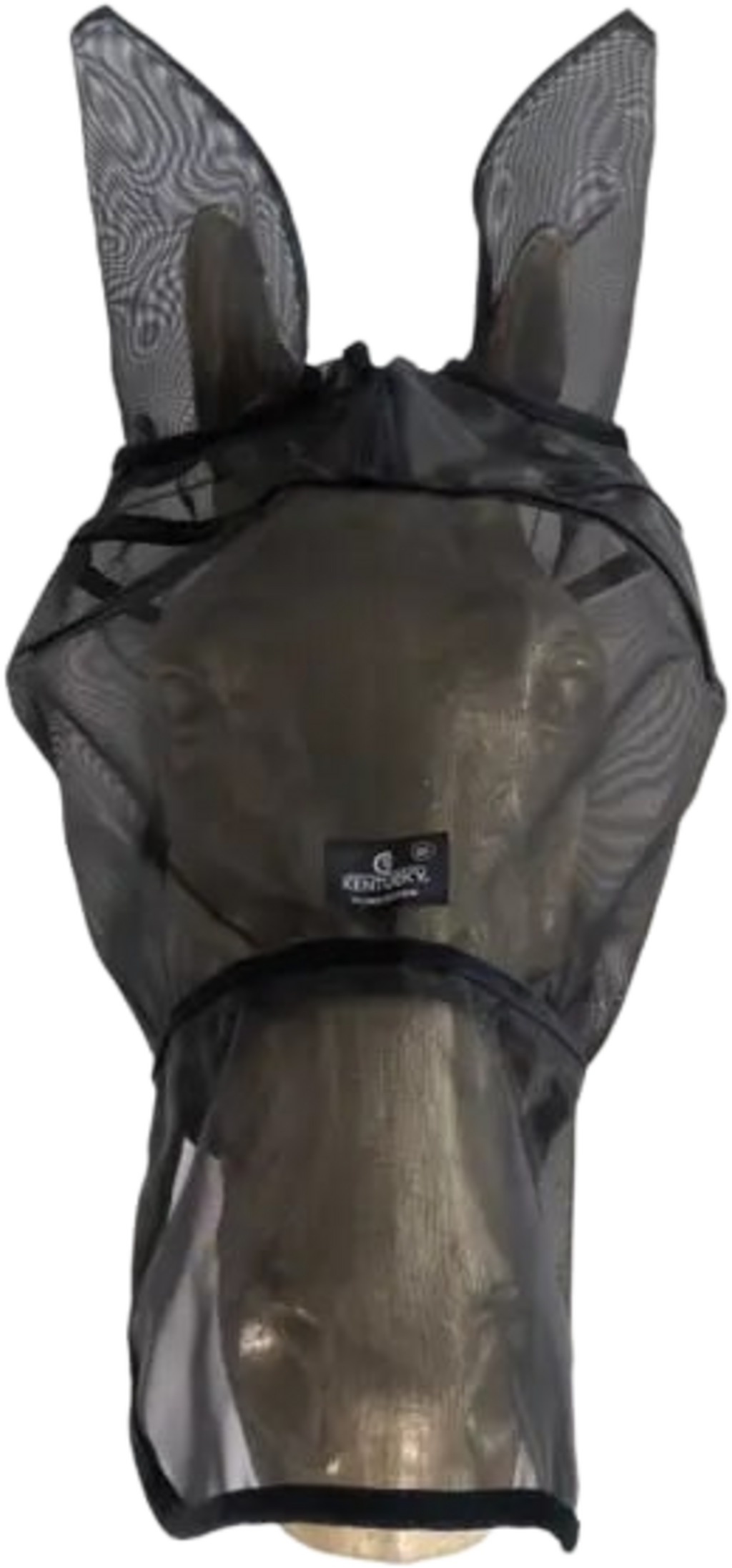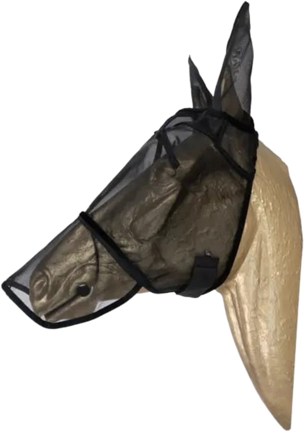 Изработена е от здрава, дишаща мрежеста материя и ликра, което я прави идеална за горещите летни дни. Пластмасов кант на челото гарантира, че маската не докосва очите на коня и запазва формата си. Закопчава се със здраво велкро закопчаване под челюстта.