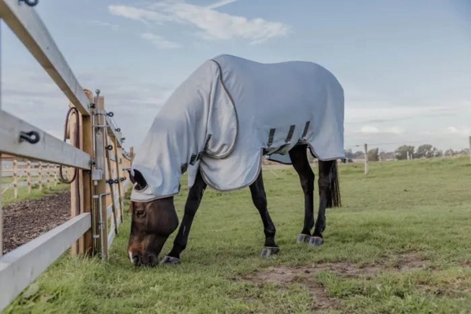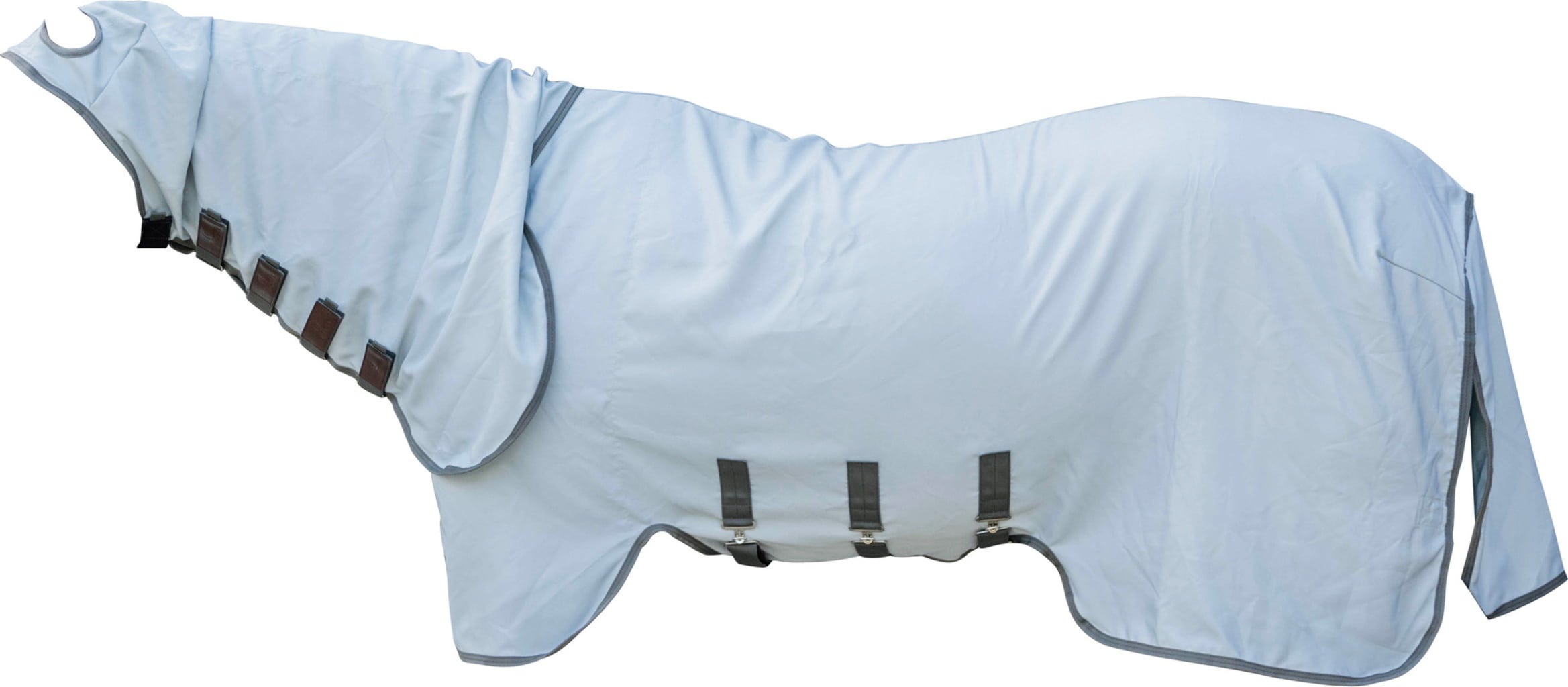 Това меко покривало против екзема е идеалният избор за коне с екзема, лятна екзема или особено чувствителна кожа. Здравият, дишащ и бързосъхнещ материал предлага максимален комфорт, като същевременно предпазва от досадни мухи и насекоми и предотвратява триенето на коня. Светлият цвят на покривалото отразява слънчевата светлина и предотвратява натрупването на топлина. С изключително дълго покривало за врата, което се закопчава върху ушите, врата на коня също е напълно защитена. Покривалото се закопчава с пет велкро закопчалки, а коремният капак е закрепен с три прави каишки. Опашният капак също е малко по-дълъг от обикновено и разполага с еластична каишка за допълнителна сигурност.