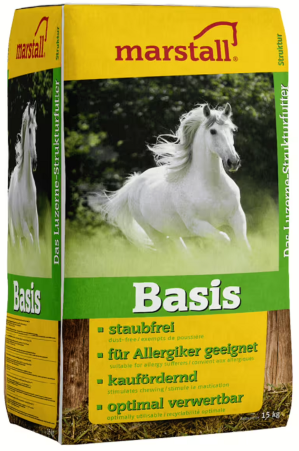 Вашият кон се възползва от подобрената дъвкателна активност, която увеличава производството на слюнка и подпомага оползотворяването на фуража. Структурата с ниско съдържание на прах също така прави marstall Basis идеален за коне с алергии към прах от сено или гъбични спори. Удобните 15-килограмови бали са лесни за подреждане и практични за хранене.