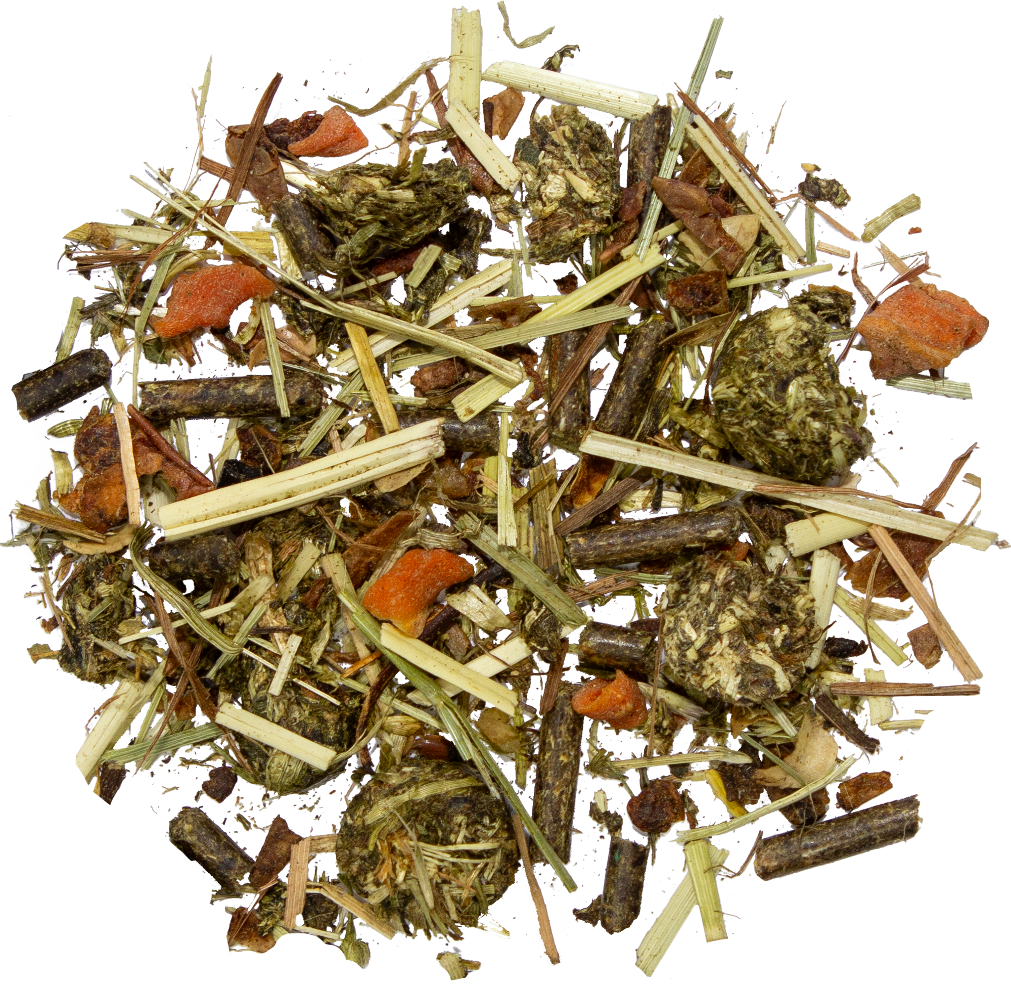 трева, изсушена при високи температури, ябълково кюспе, шрот от лен , Бирена мая, коприва, Истинска лайка, Маточина, Корен от глухарче, Трицветна теменуга, Живовляк , Слез, Орехови листа, тимотейска трева, 3 % брашно от морски водорасли, ленено семе, Рафинирано рапично масло, калциев фосфат, Mорковен флейкс, Метилсулфонилметан (MSM)
