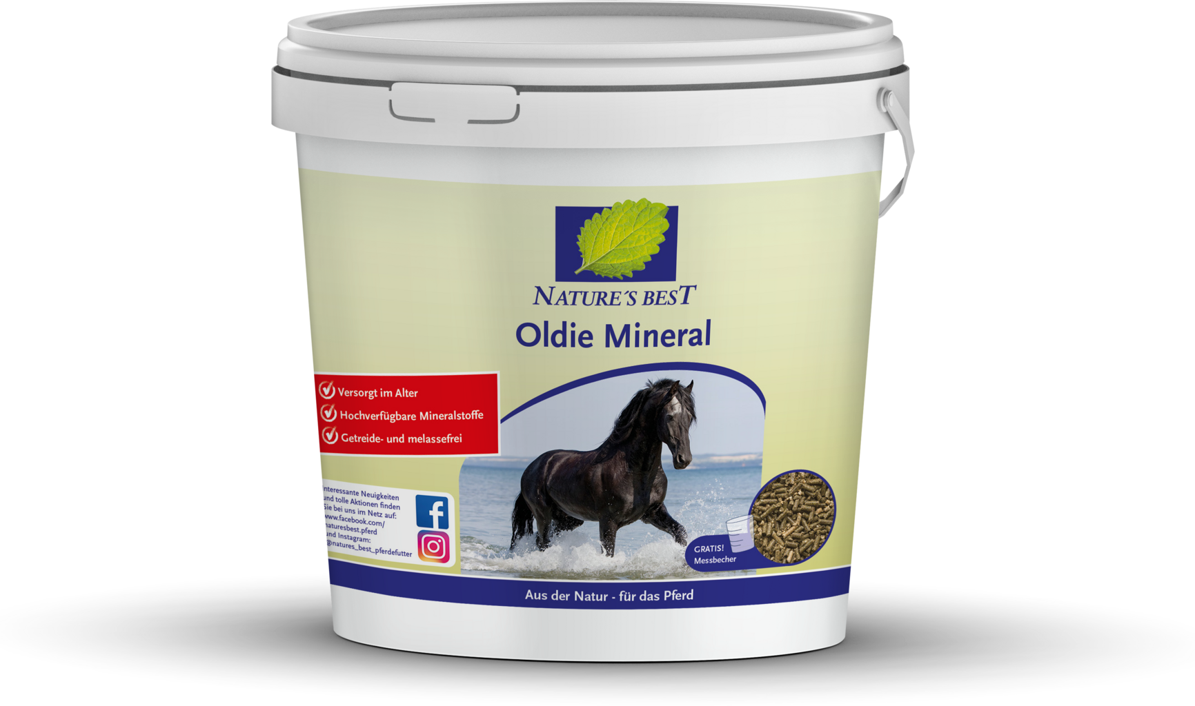 Възрастта понякога може да бъде фактор, който ограничава усвояването на минерали, докато нуждата от минерални добавки се увеличава. За да отговори на това предизвикателство, Nature's Best разработи Oldie Mineral, формула, специално разработена за нуждите на стареещи и по-възрастни коне. Формулата съдържа оптимално бионалични минерали и витамини, което означава, че малко количество за хранене е достатъчно за пълно снабдяване с минерали. Освен това, Oldie Mineral не съдържа зърнени храни и меласа, което може да помогне за облекчаване на метаболитното натоварване и го прави подходящ за хранене на коне с метаболитни проблеми. Допълнена с вкусна бирена мая, фини ябълкови люспи и корени от цикория, тази минерална смес за нашите по-възрастни коне се отличава и с добър вкус. Препоръка за хранене: