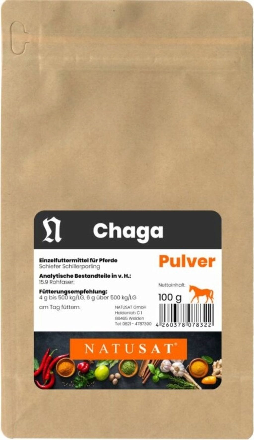 Гъбата чага, известна още като горска кокошка, е ценена заради високото си съдържание на хранителни вещества. За Чага прах от NATUSAT се използват само внимателно изсушени, цели плодни тела с най-високо качество.