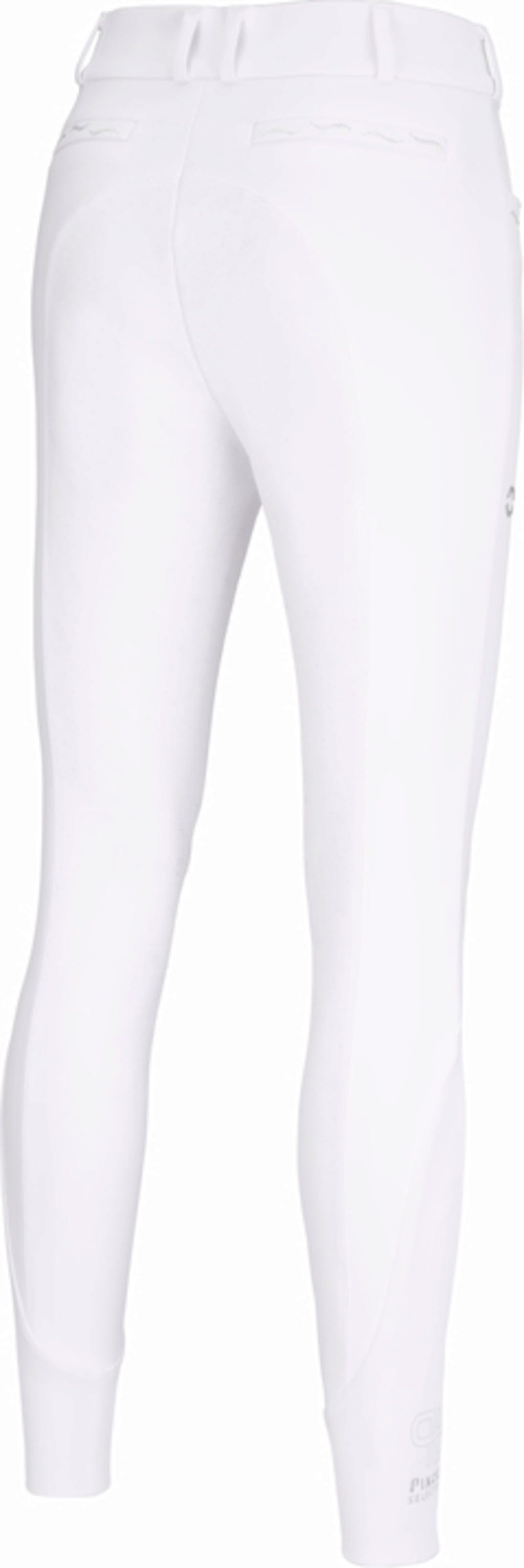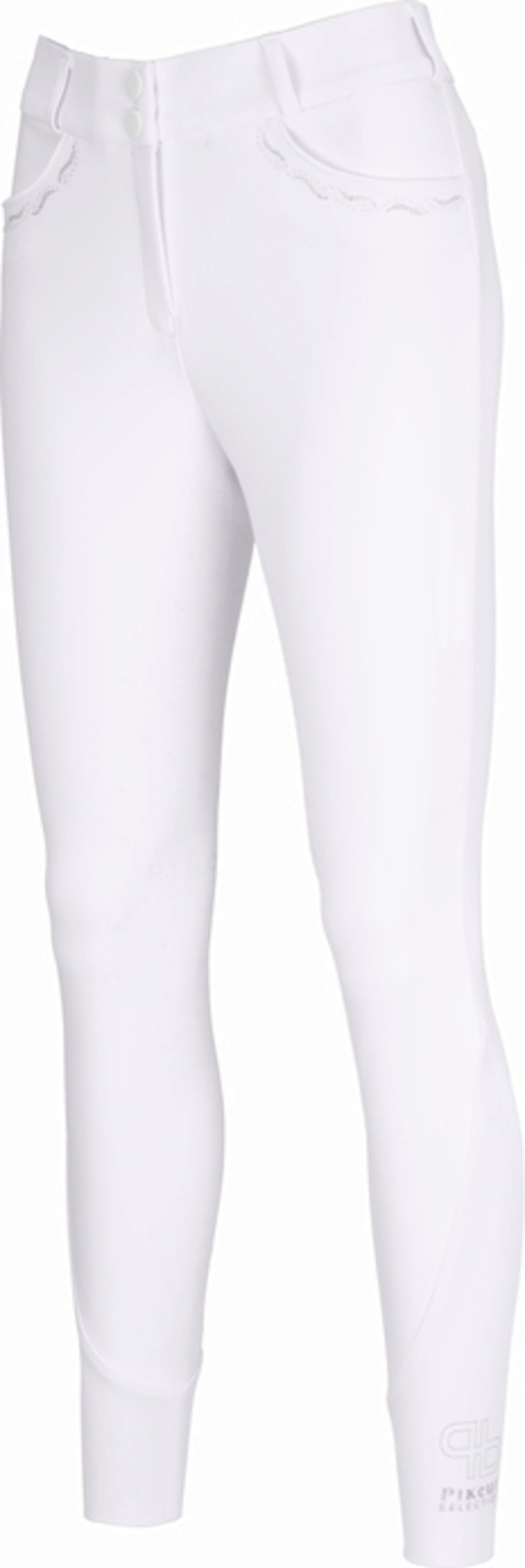 Ласкателни фигурата бричове за езда, изработени от изключително флексонепрозрачна, разтеглива в 4 посоки материя – това са PIKEUR CEELINA SD с матово покритие. В бяло, те са проектирани с допълнителна непрозрачност, ефективно прикривайки всякакви несъвършенства. Спортният им дизайн е допълнен от ситопечатна тапицерия в дизайна Selection. Кръгли странични джобове и джобове с имитация на кант с апликации от кристали, кристали, плискащи по страничния шев, и щампи PIKEUR Selection от двете страни на отворите за крачоли допълват визията им. Дизайнът също така умишлено пропуска джоб за смартфон.