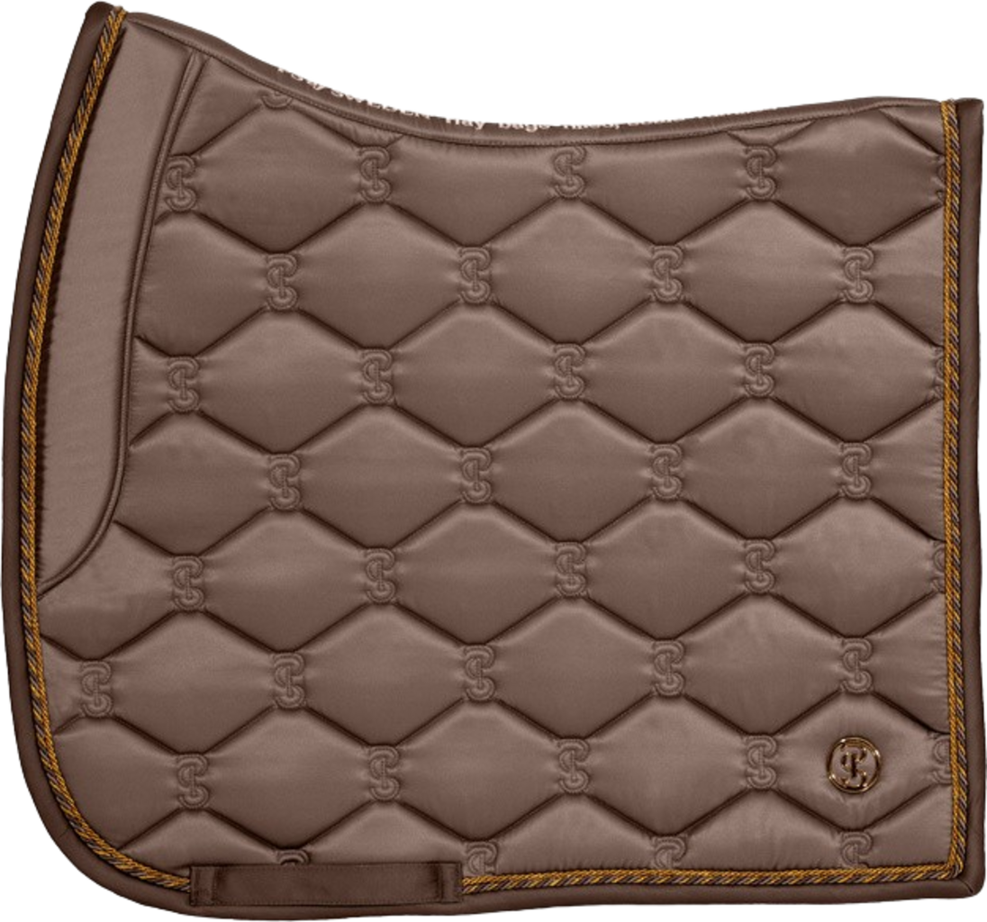 Благодарение на средно дебелото подплатяване и Stop Cushions, подложката остава сигурно на мястото си по време на тренировка или в манежа. Специални детайли като декоративната капитонирана шарка, елегантните кантове и бродираният цитат по протежение на гръбначния стълб я правят истински привличаща вниманието. С бродираните каишки за колана и металното лого на PS, Saddle Pad Dressage Signature впечатлява и по отношение на изработката и дълготрайността.