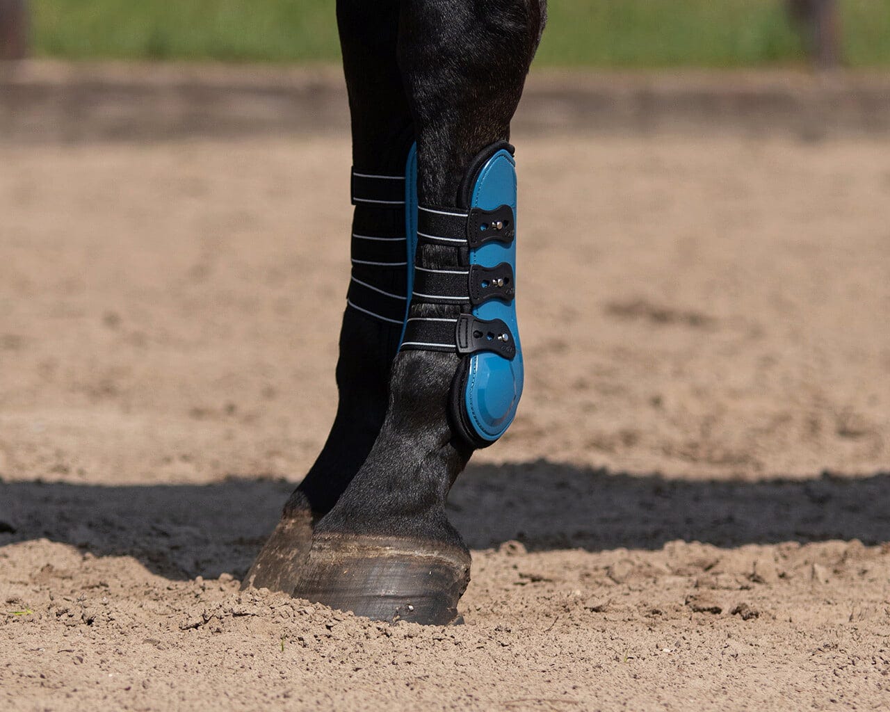 Тези спортни гамаши с твърда черупка в наситено стоманено синьо са разработени, за да предпазват надеждно сухожилията на задните крака на вашия кон от удари и сблъсъци. Благодарение на интелигентната технология на материалите, те предлагат идеална комбинация от максимална защита и ефективно управление на топлината.