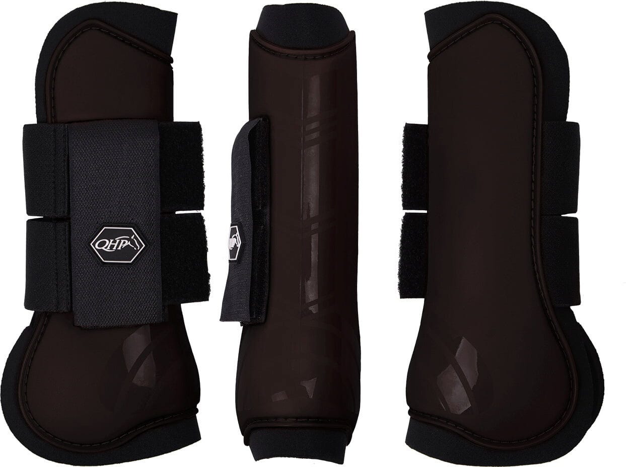 Този комплект от две анатомично оформени гамаши с твърда черупка в стилно кафяво е идеален за защита на краката на вашия кон по време на тренировки и състезания.