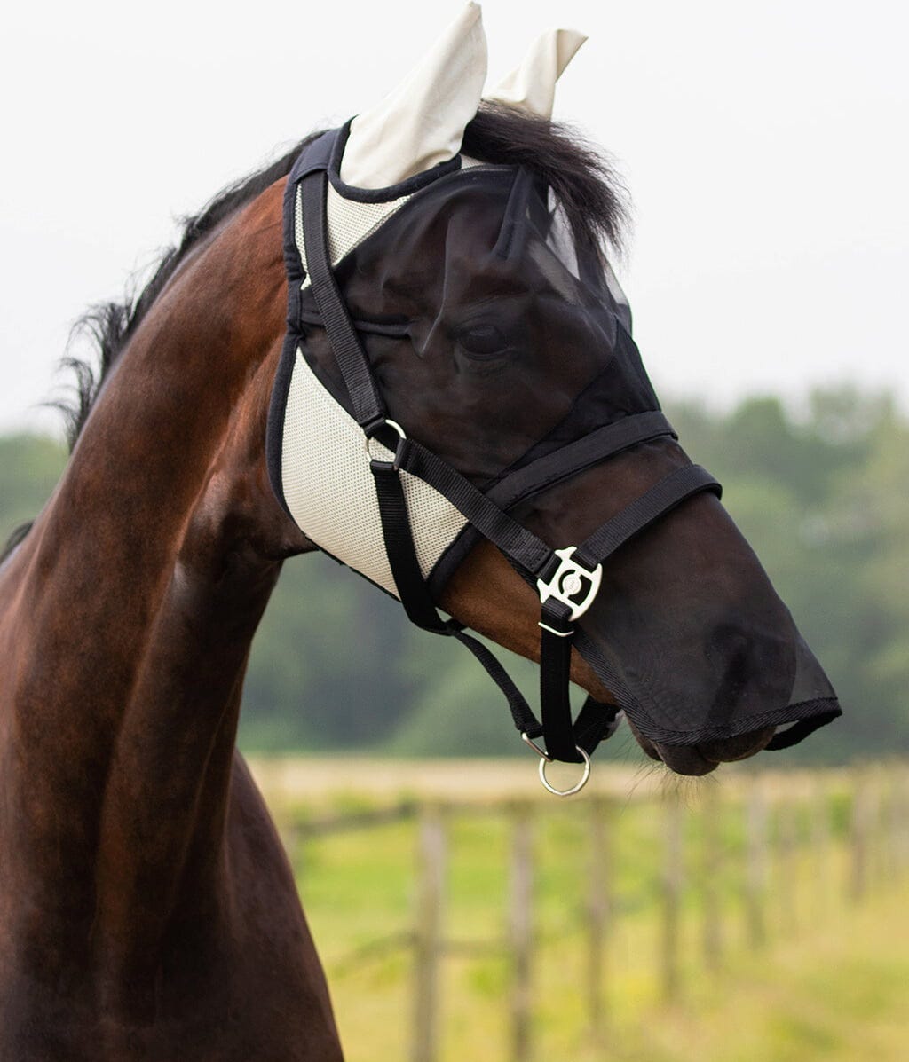 Защитете коня си надеждно от мухи и насекоми с функционалната и удобна QHP маска против мухи с подвижен предпазител за носа. Тази маска съчетава обмислен дизайн с висококачествени материали и гарантира, че конят ви ще остане спокоен дори в топлите дни.