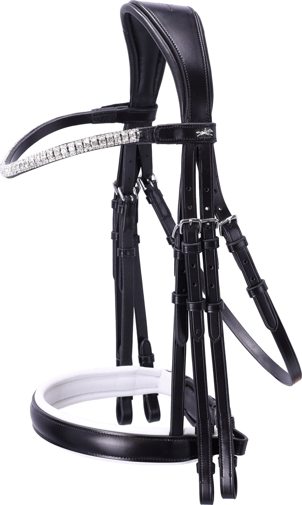 Изработена от висококачествена екокожа, двойната юзда за дресаж Brindisi се представя с изискан и елегантен дизайн. Това е подчертано от безшевна кристална лента за вежди с големи и малки кристали. С анатомично оформената си част за глава, тя намалява натиска върху главата на коня и предлага оптимален комфорт. Лентата за вежди е снабдена със система за закопчаване с тик-так и велкро за бърза и лесна смяна.