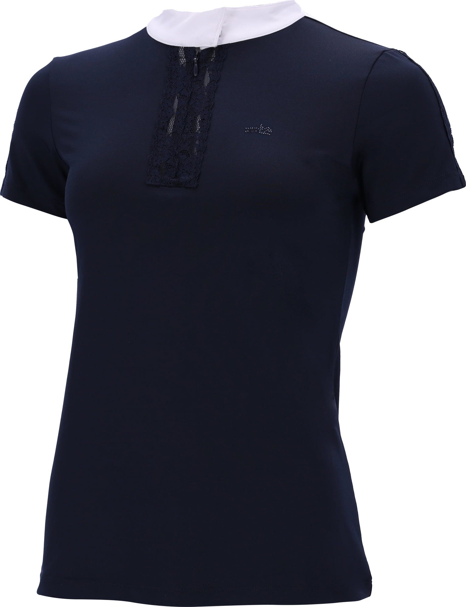 Подгответе се за турнирния сезон 2024 с първокласната състезателна тениска SP Christina Style от Schockemöhle Sports. Възползвайте се от изключителен комфорт благодарение на дишащите и бързосъхнещи свойства. Спортната яка на тениската и дантелената облицовка по ципа са визуално впечатляващи. Апликация от кристали в тон допълва дизайна.