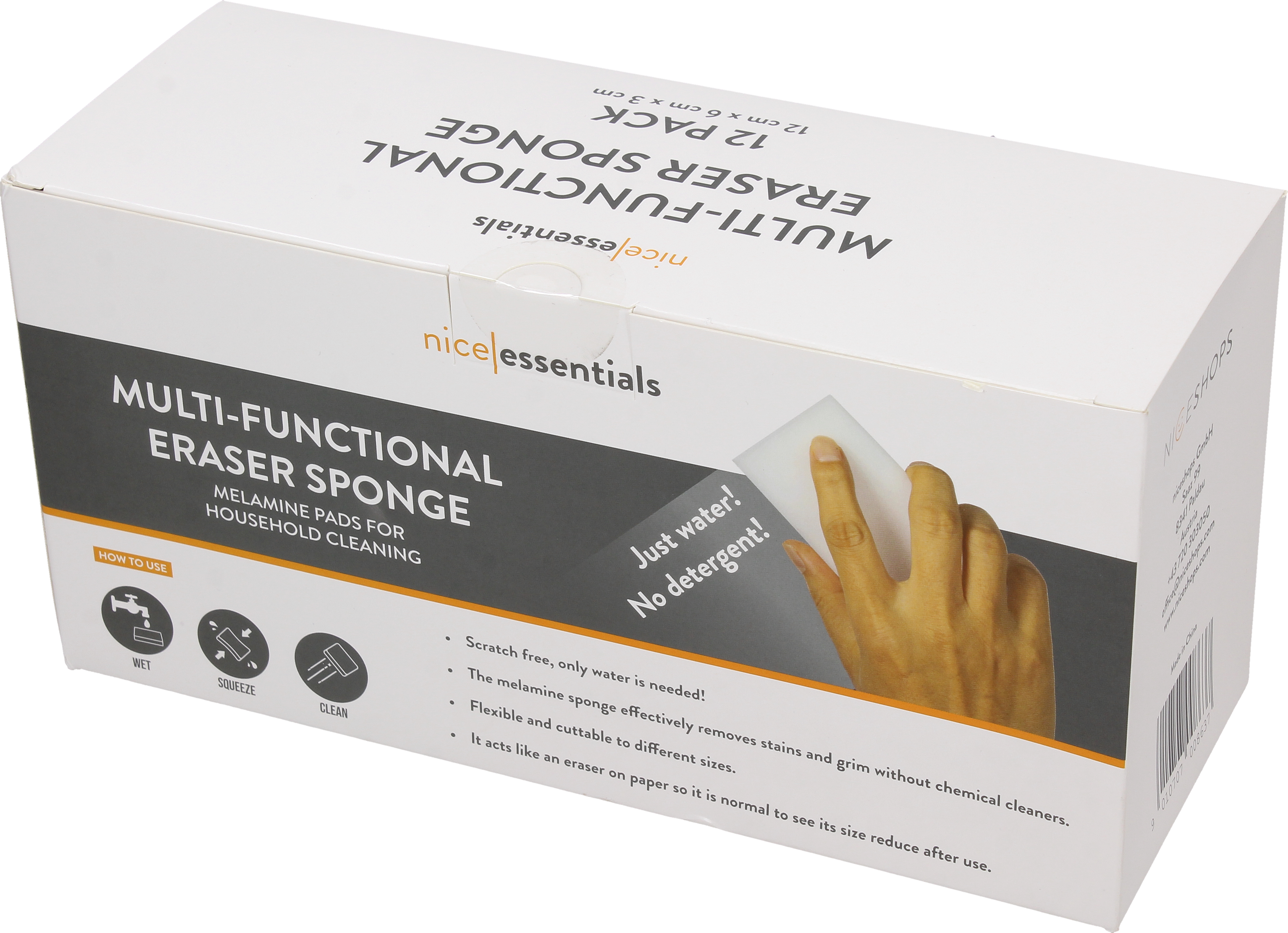 Петна, сив налеп или лепкави остатъци? С меламиновите гъби за почистване от nice essentials тези замърсявания изчезват като с магия! Просто навлажнете леко гъбата, избършете замърсената повърхност и наблюдавайте как мръсотията изчезва – без никакви почистващи химикали!