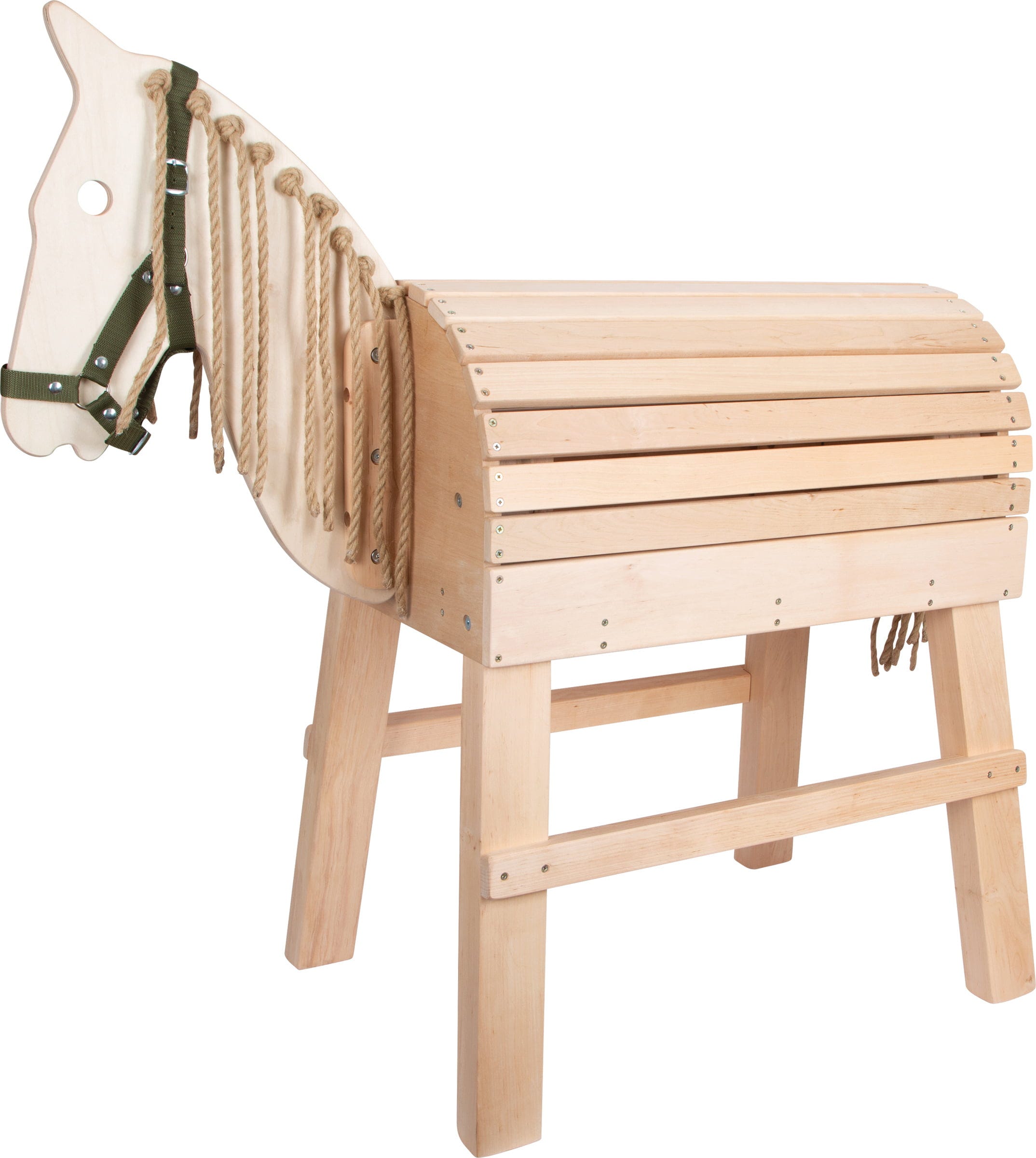 Необработената дървесина ви позволява да персонализирате коня по ваш вкус. С удобна височина на седалката и висока товароносимост, нищо не пречи на забавлението при скачане. Включен е и оглавник – така че приключението на дървения кон може да започне веднага!
