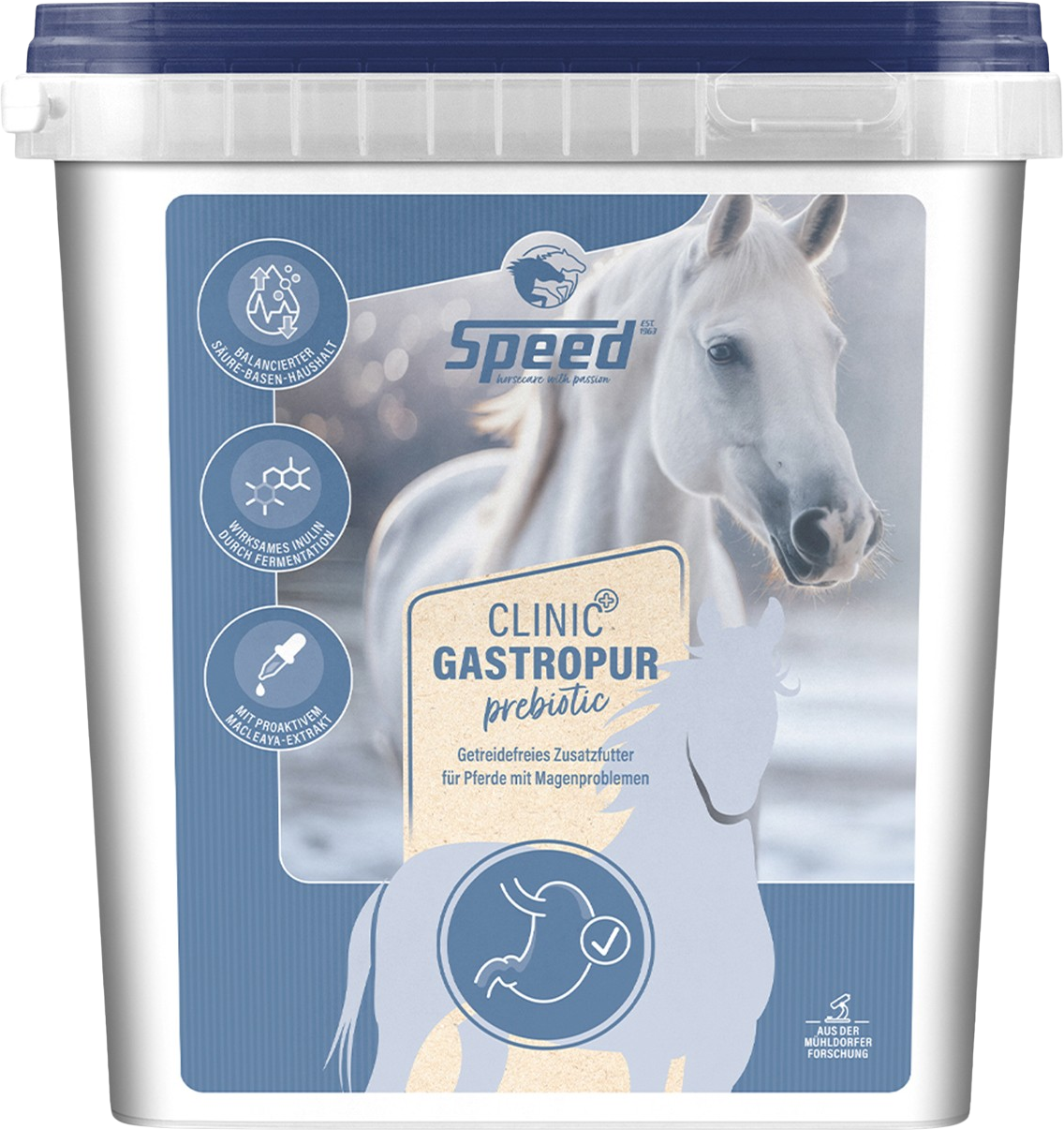 Clinic Gastropur Prebiotic е специално разработен за коне с чувствителен стомах и е напълно без зърнени култури. Формулата комбинира богата на фибри основа с подбрани функционални съставки на растителна основа и ферментирал концентрат от сок от йерусалимски артишок – резултатът е продукт, който се интегрира перфектно във вашата стратегия за хранене.