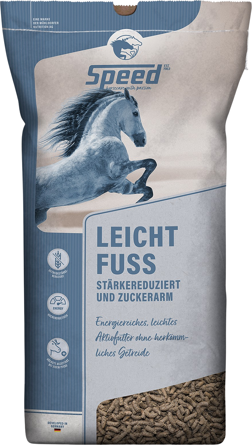 SPEED Leicht Fuss е високоенергийна, лесно смилаема храна за коне без конвенционални зърнени култури. Предназначена за коне със специални нужди или метаболитни проблеми. Богатата на протеини рецепта, приготвена от оризови трици и различни маслодайни семена, специално подпомага развитието на мускулите и устойчивото снабдяване с енергия.