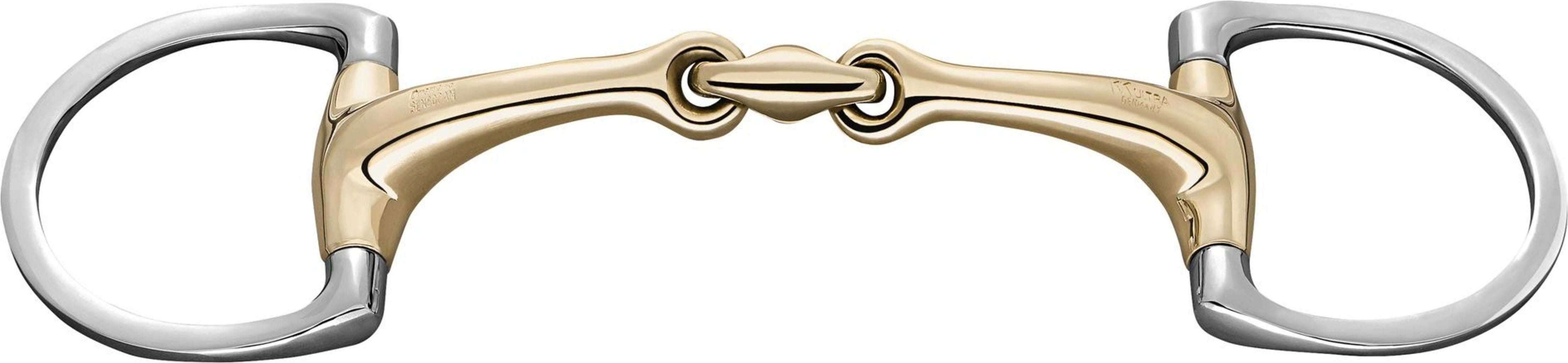 Двойно съчленен трензель с маслинена глава и анатомично правилен D-образен пръстен. Това разпределя налягането равномерно върху добре подплатения език, предпазвайки чувствителните зони на устата. Централната връзка е наклонена напред под ъгъл от 45°, което позволява на езика да използва пълноценно чувството си за допир.