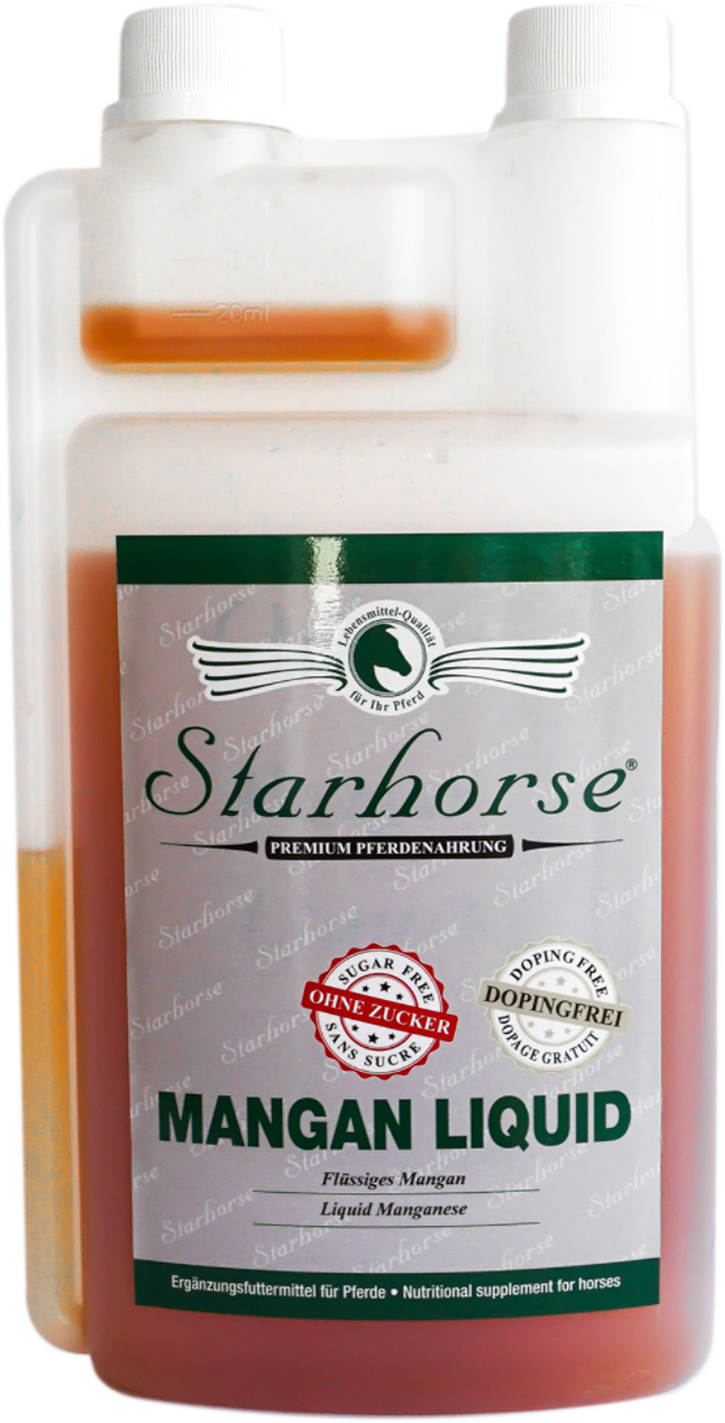 Ако чрез пасищна трева или сено не се приема достатъчно манган, се използва Mangan Liquid. Тази добавка без зърнени култури попълва запасите от манган и по този начин може да подпомогне метаболизма, мускулите, зъбите, костите, ставите и съединителната тъкан. Особено при спортни коне и отглеждането на млади коне, манганът може да укрепи целия скелет и да осигури повишена устойчивост.
