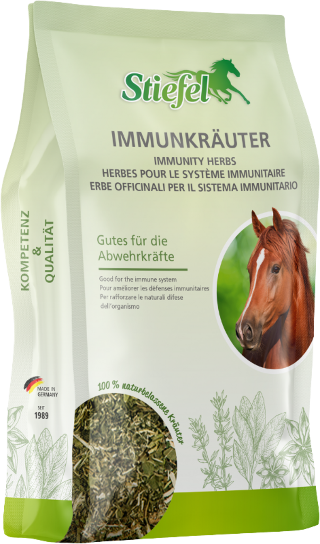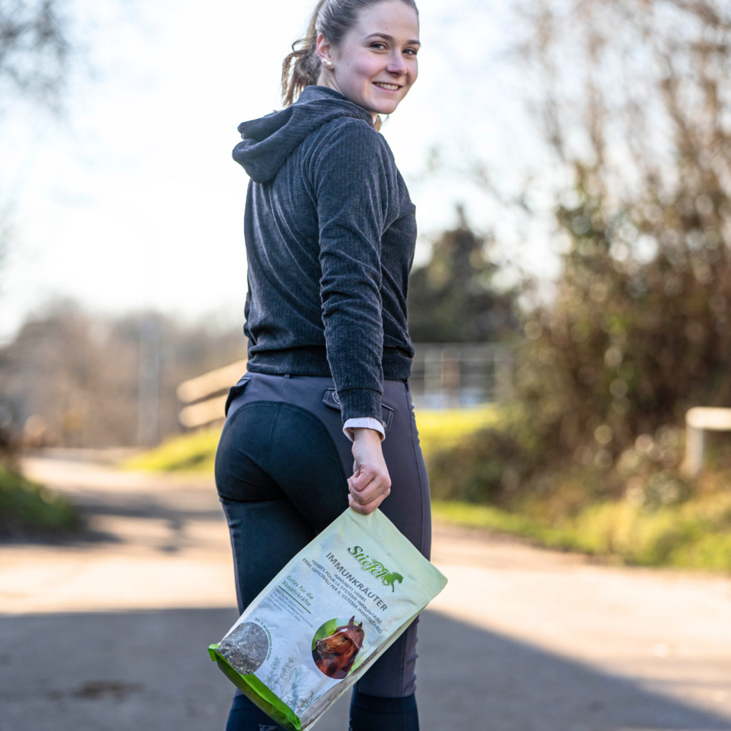 Подбраната билкова смес на Stiefel може естествено да подкрепи имунната система на вашия кон, укрепвайки я. Имунната система постоянно се сблъсква с вируси, бактерии или други фактори на околната среда. Ако е здрава, патогените могат да бъдат отстранени. Тези билки могат да активират производството на кръвни клетки, които действат срещу патогени. Следователно защитните сили на вашия кон могат лесно да бъдат засилени и болести предотвратени. С ехинацея, женско биле, шипка, корен от тайга, златна пръчка, мента.